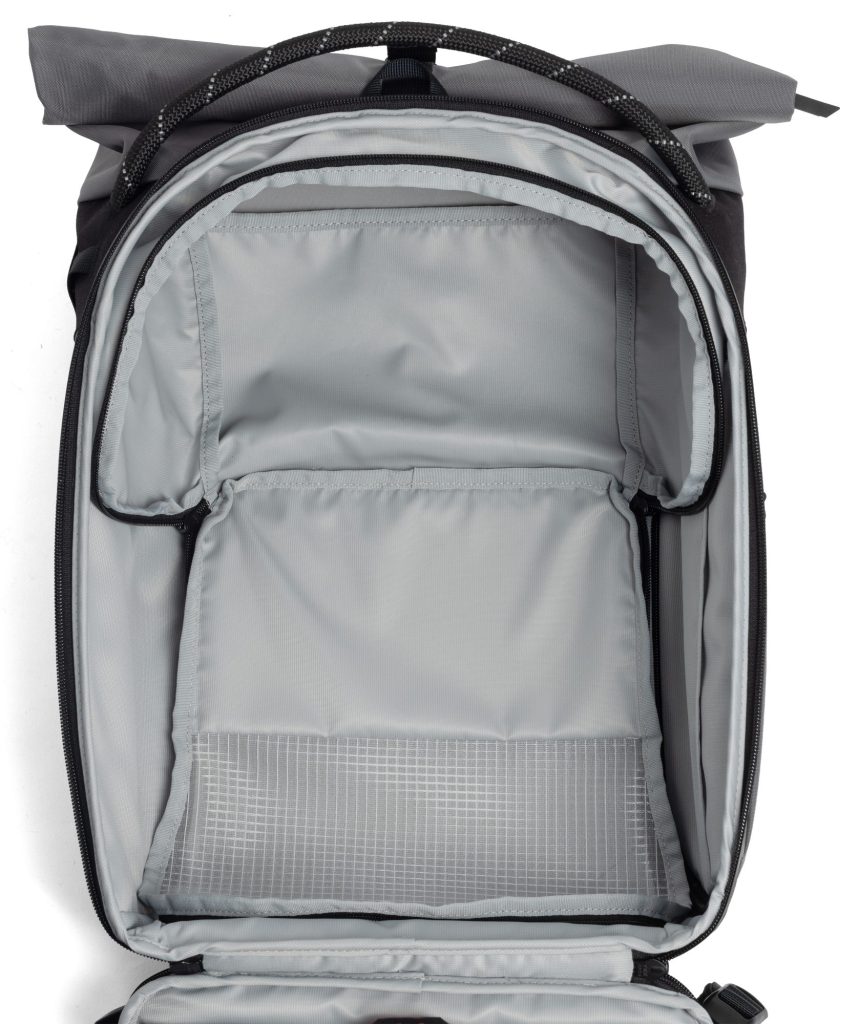 荷物のボリュームに合わせて高さを調整できるSmartLift 機構を採用しています。上下コンパートメントの仕切はベルクロではなくファスナーで固定しているため、開放すると引っかかりのない大容量収納空間を確保することができる。