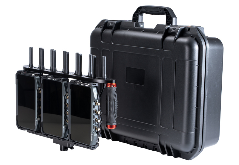 『CineView M7 Pro 3連モニターキット』は、専用ケージにCineView M7 Proを3台セットし、一体化させることにより、高い安定性と効率的な運用を実現。Vマウントバッテリー1本でシステム全体に給電できる。さらに、幅広い信号互換性で多様な機器接続に対応。