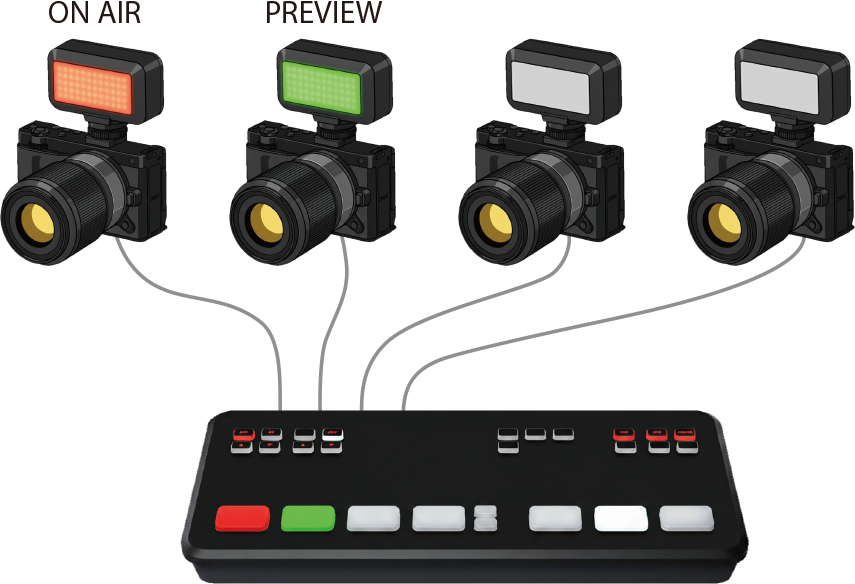 給電はカメラから行われるためバッテリーなどの外部電源も不要。カメラを対応しているスイッチャーに接続すると、HDMI-CECにより送信されるタリー制御信号を受信して、タリーライトの制御を行う。機動性が求められる現場において、カメラとライトのみで完結する身軽なワークフローを実現。