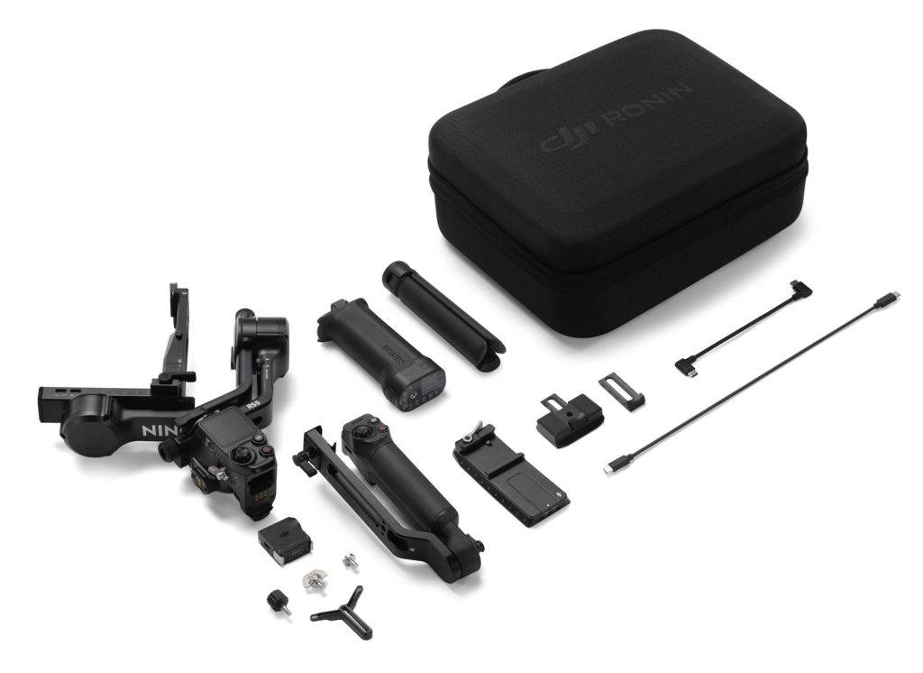 DJI RS 5コンボ:DJI RS 5(単体)の同梱物に加え、RS 強化型スマートトラッキングモジュール、電子ブリーフケースハンドル、L字型ケーブル、キャリーケースが追加で付属