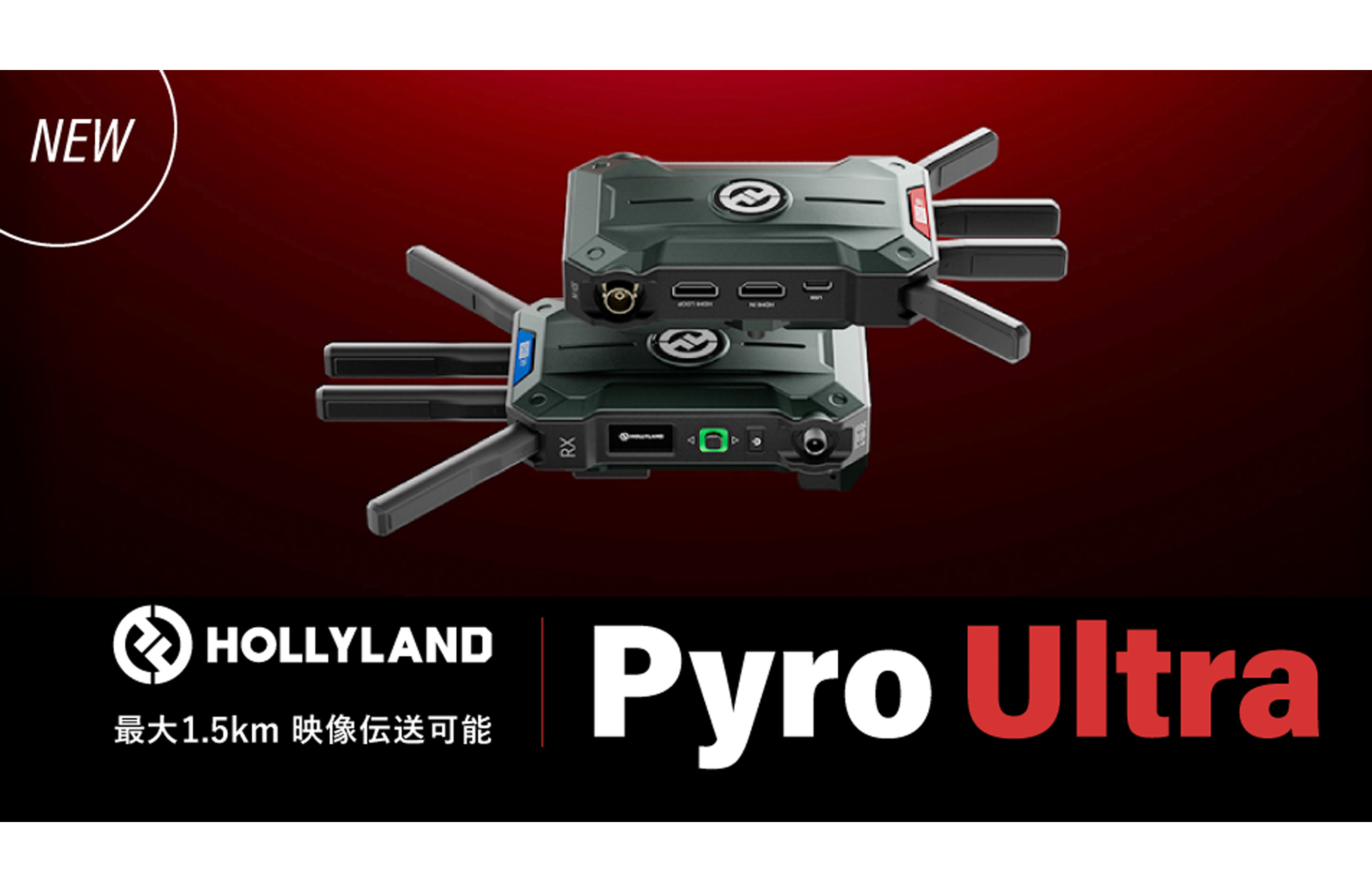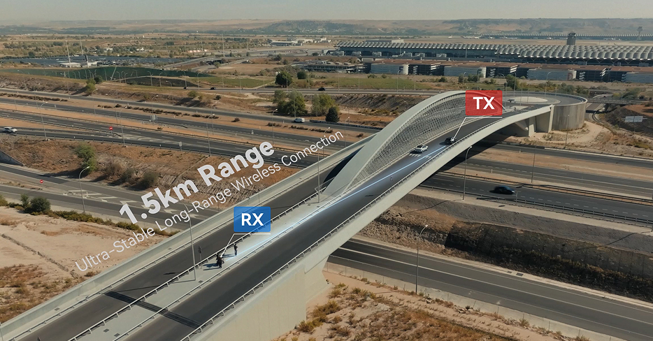 また、最大1.5kmの見通し伝送距離に対応。さらに自動周波数ホッピング機能により干渉を抑え、混雑した環境でも安定した映像伝送が可能。