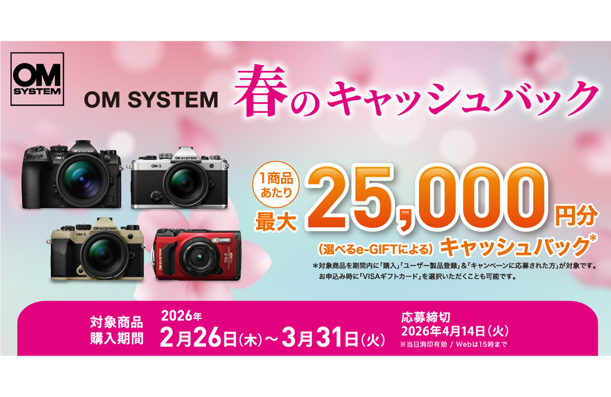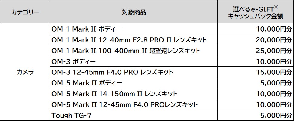 OMデジタルソリューションズ株式会社は、対象のミラーレス一眼カメラ(レンズキットを含)、およびコンパクトデジタルカメラ購入者を対象に、1商品あたり最大25,000円分の「選べるe-GIFT」をプレゼントする『OM SYSTEM 春のキャッシュバック』キャンペーンを2月26日より実施する。