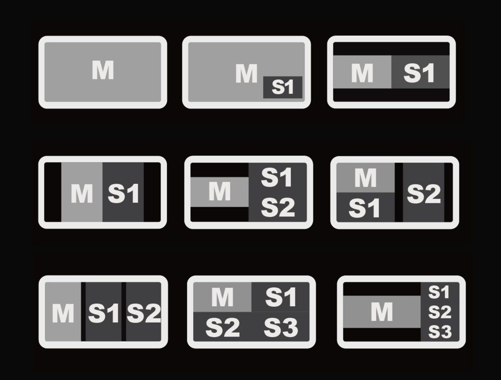 予め用意された、1つ、2つ、3つ、4つの複数ソースを組み合わせたレイアウトから、現場に合わせた表示を選んでスムーズに切り替えられる。スマートフォン向けの縦型映像を3つ並べて表示したり、モニターを縦に固定して3つの横位置映像の余白を最小限に抑えて大きく表示したりするなど、多彩なモニタリングを実現。