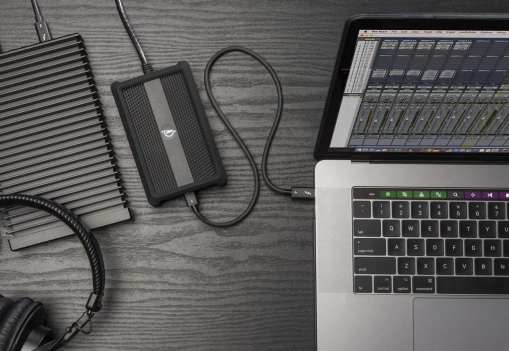 Thunderbolt 4/USB4ポートからのバスパワーで動作する。ACアダプターや電源ケーブルが必要ないため、Thunderboltケーブル1本だけでパソコンに接続できる。本体ボディは放熱性能に優れたアルミ製のヒートシンク構造。さらにファンレス仕様により、作業を妨げる動作音を発生しません。