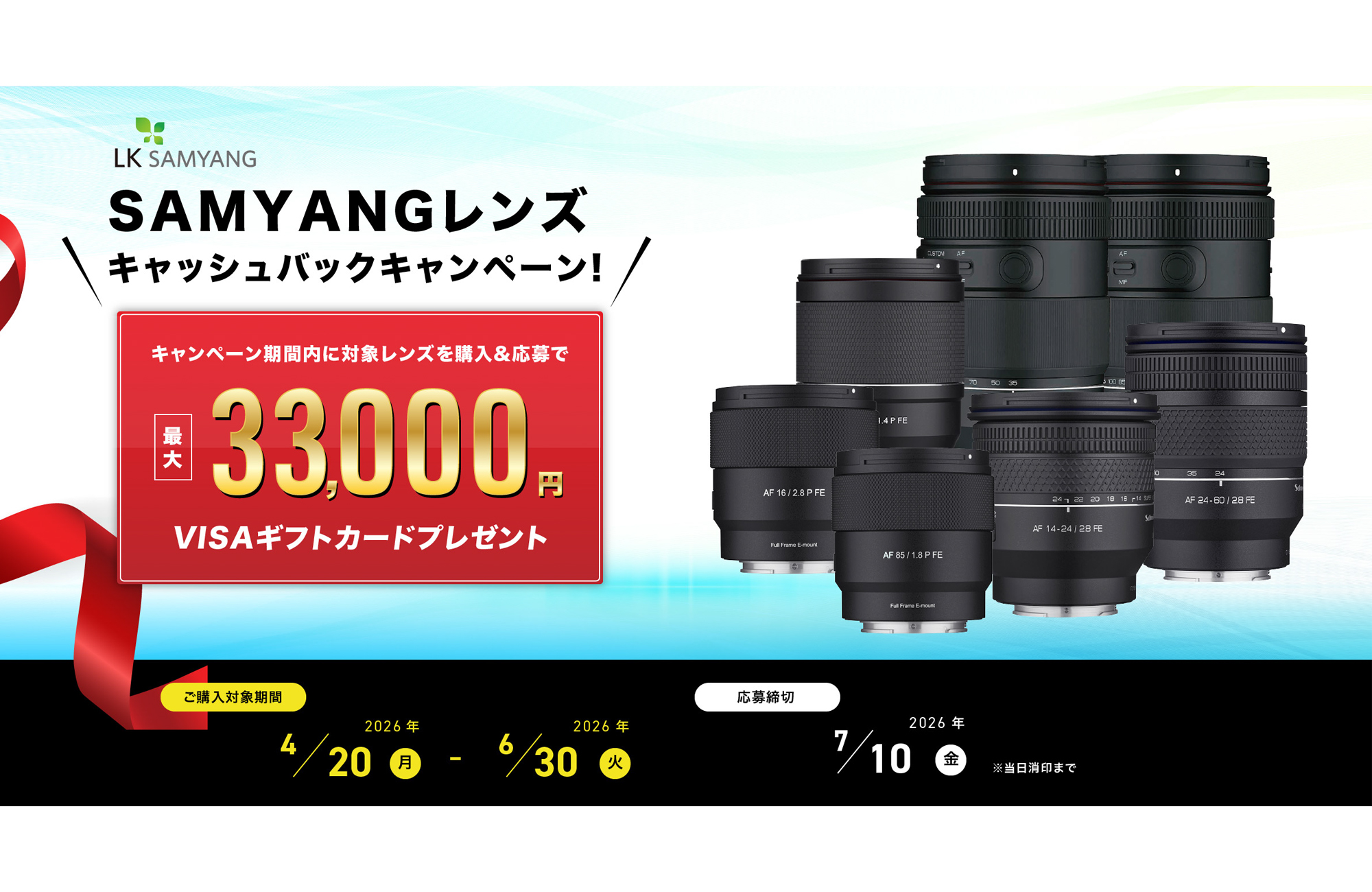 株式会社ケンコー・トキナーは、最大33,000円をVISAギフトカードで還元する「SAMYANGレンズキャッシュバックキャンペーン」を実施する。4月20日~6月30日の期間中に対象レンズを購入の上、所定の応募用紙で応募。