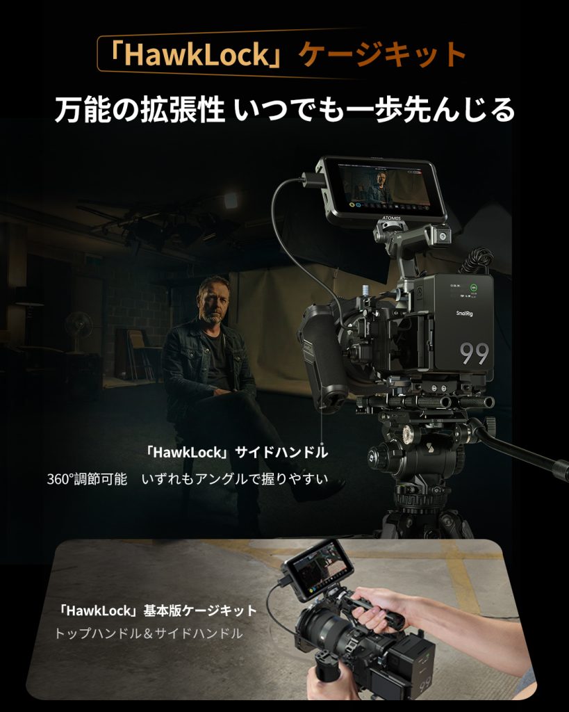 「HawkLock」ケージキットは、ワンタッチのクイックリリース機構で一秒での作業開始を実現し、専用トップハンドルとサイドハンドルを備えたシステム拡張で完全な操作性を提供。3点固定ロックでカメラをしっかり保護し、画面のブレを防止。豊富な拡張性で、様々なグリップ、マイク、アームなどへの接続が自由、さらに、ハンドル、三脚、DJI スタビライザーへのシーン切り替えを迅速化する。