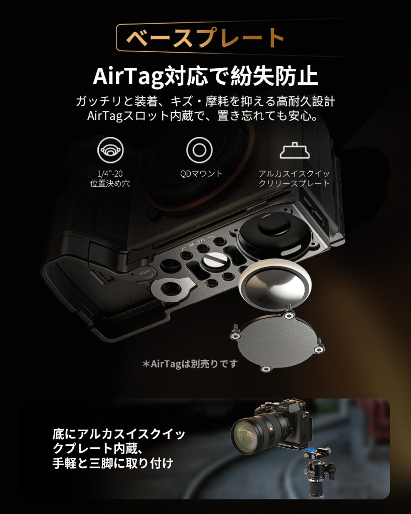 SmallRig Sony α7 V/7R V/7 IV用ベースプレート(136g)は、軽量保護とAirTag内蔵で安心。アーカスイスクイックリリースプレートで三脚へ瞬時切替、豊富な拡張インターフェースで様々なアクセサリーに接続でき、安定した作業を実現します。