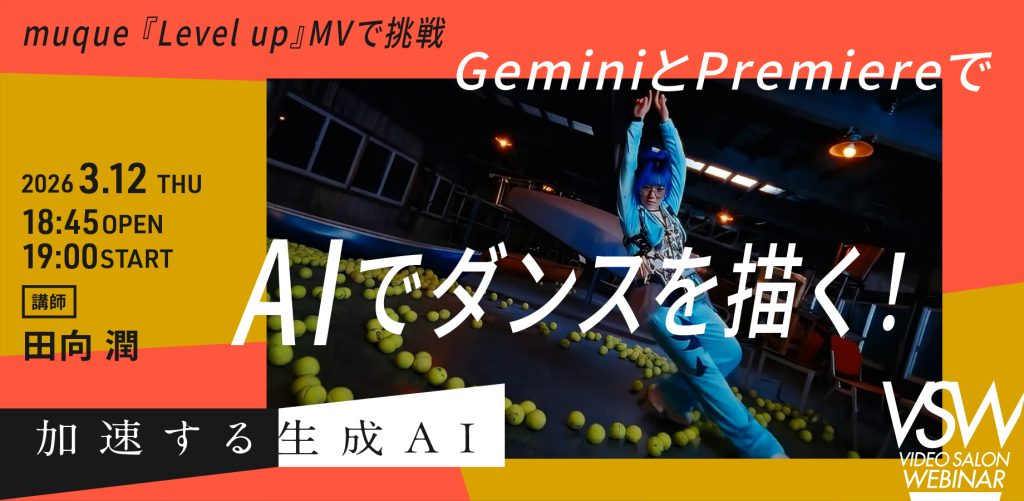 【3月12日(木)開催】VSW348「MV with Gemini/muque 『Level up』MVで挑戦 GeminiとPremiereを使ってAIでダンスを描く!」講師:田向 潤