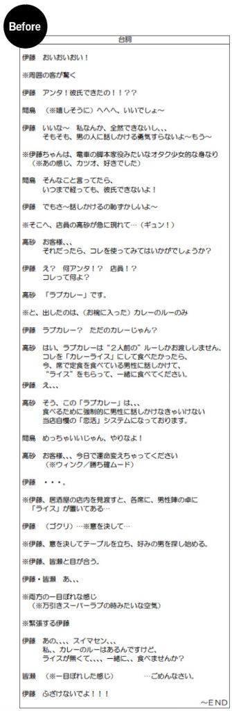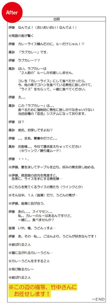 例えば、カツオさんの記事にも出てきた『ラブカレー』の初稿の話で言えば、「彼氏が欲しい」というやりとりは別に必要ない話だと思ったんです。それよりも、「ラブカレー」というカツオさんのヤバい発想を全面に出したほうがいいと思ったので、撮影稿では不要な部分を大幅にカットしました。