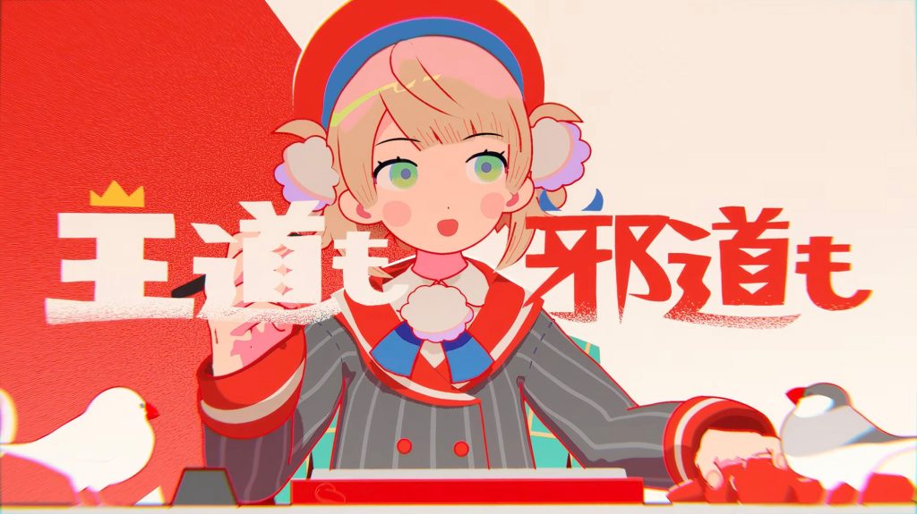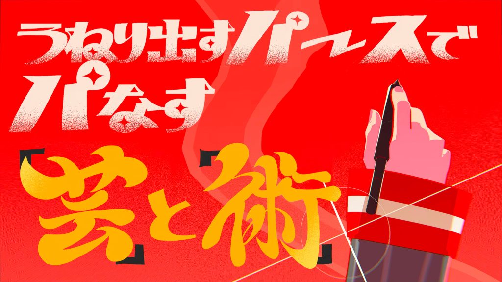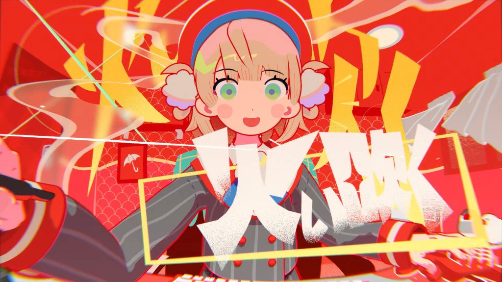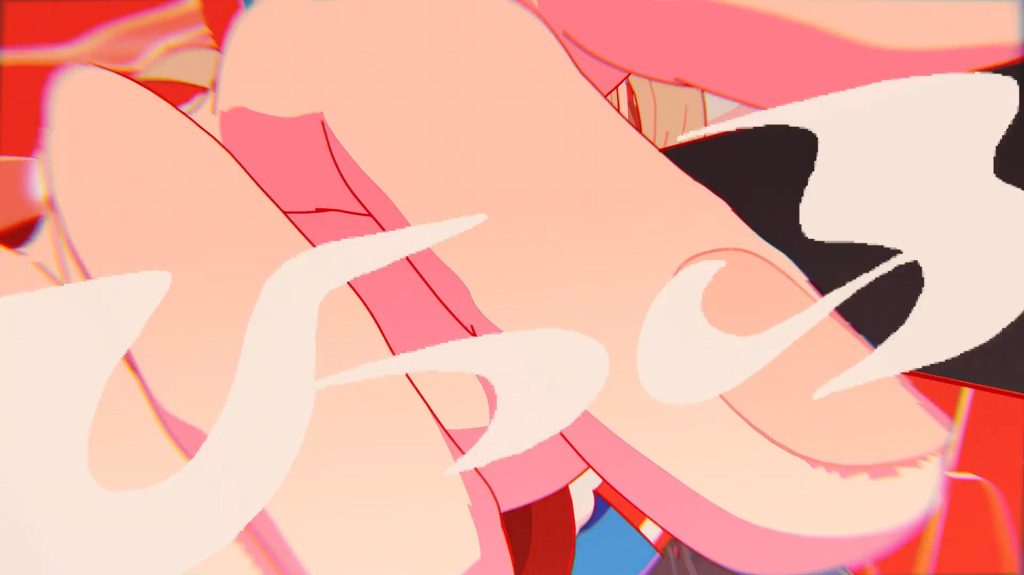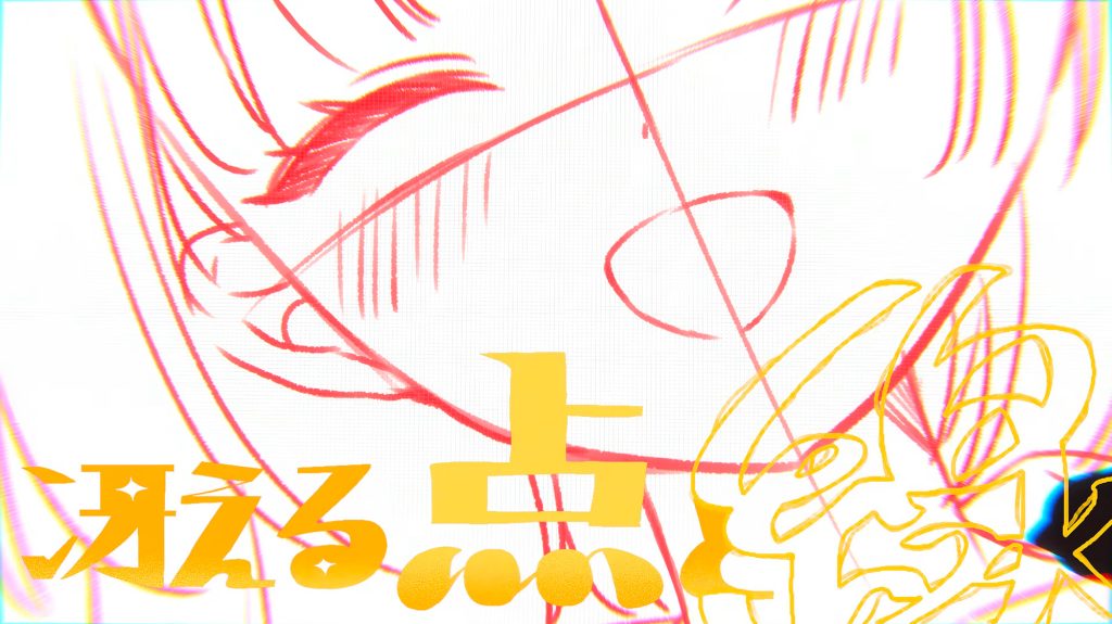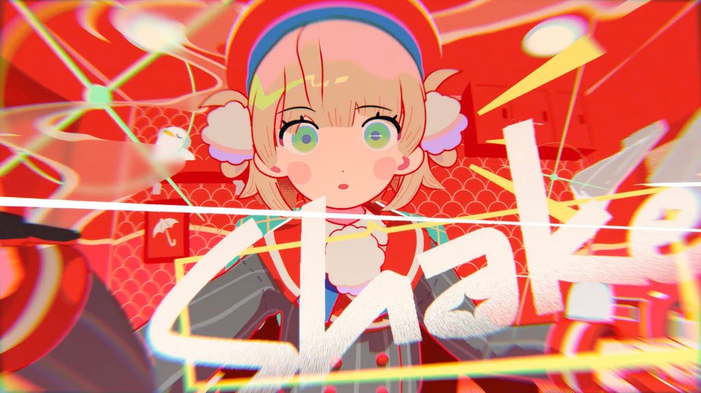 歌い始めの「shake a 火ぃ吹く pallettes」という歌詞のカットでは、画をネガポジ反転させつつ、一瞬だけ黒色の筆で描いたような横線を入れることで、ういの表情に目線が行くように演出。そして顔の周りに歌詞のモーションをレイアウトすることで、キャラクターと歌詞のどちらも認識できるように画づくりが行われた。