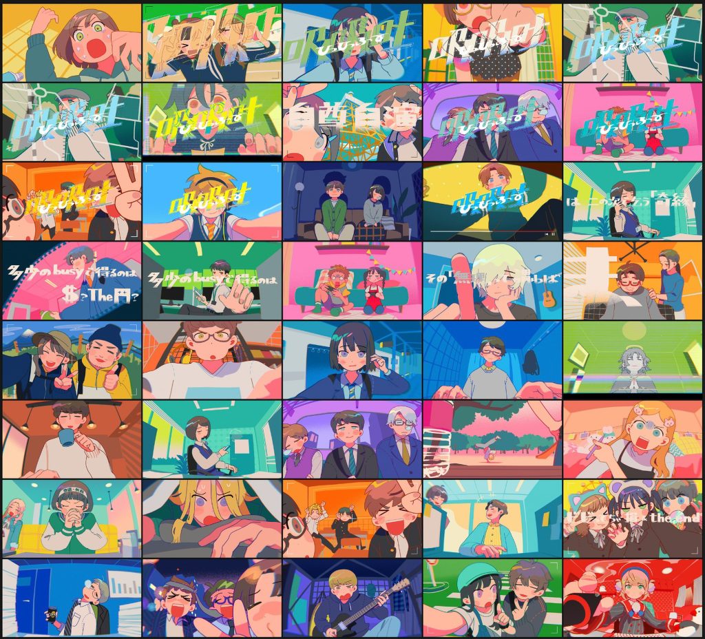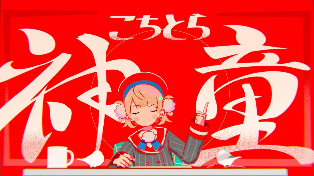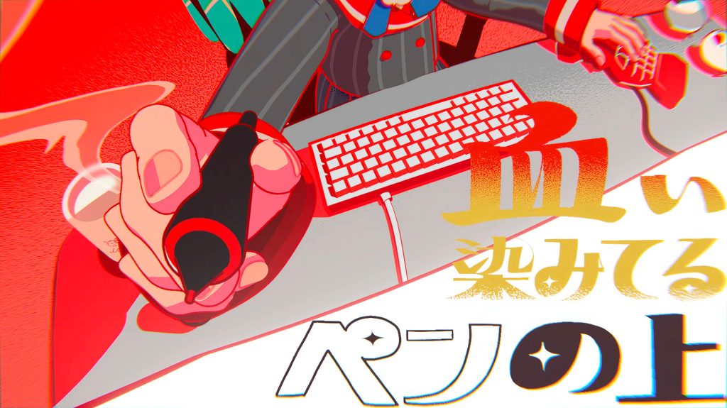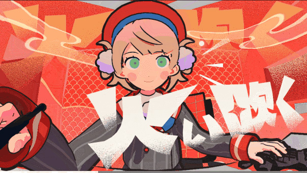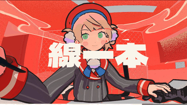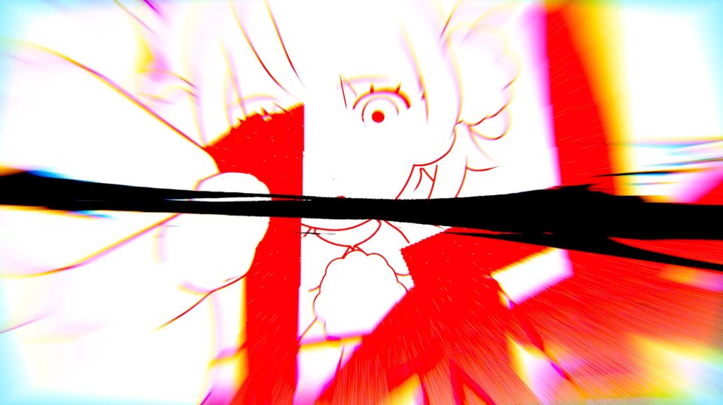 歌い始めの「shake a 火ぃ吹く pallettes」という歌詞のカットでは、画をネガポジ反転させつつ、一瞬だけ黒色の筆で描いたような横線を入れることで、ういの表情に目線が行くように演出。そして顔の周りに歌詞のモーションをレイアウトすることで、キャラクターと歌詞のどちらも認識できるように画づくりが行われた。