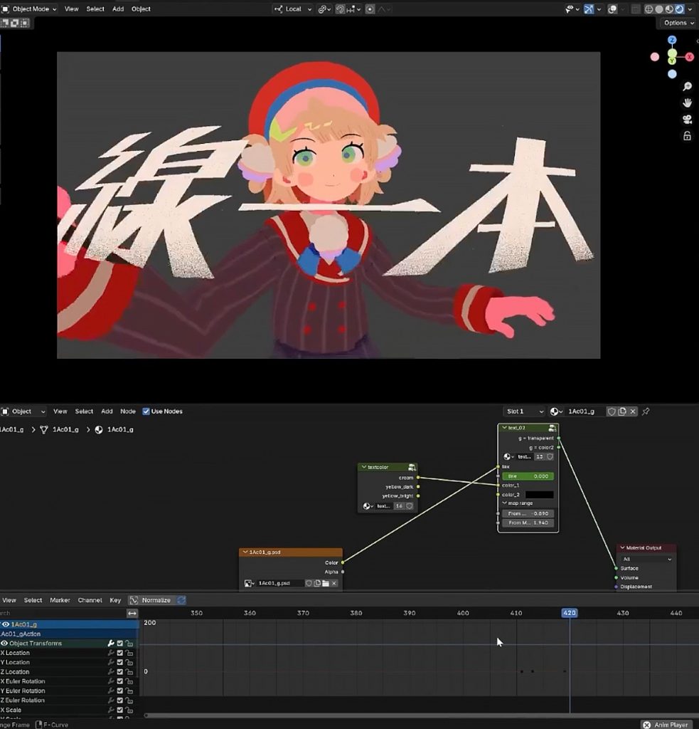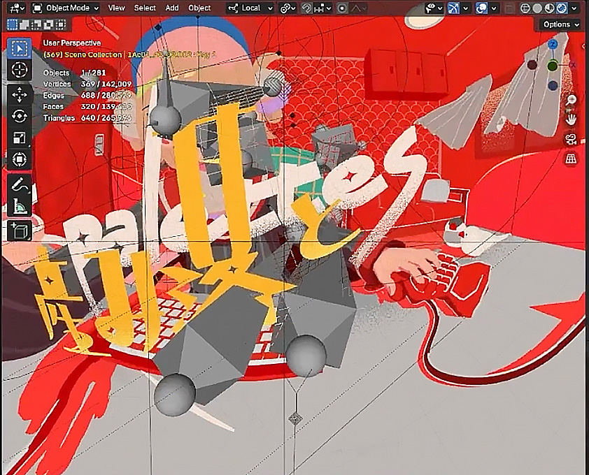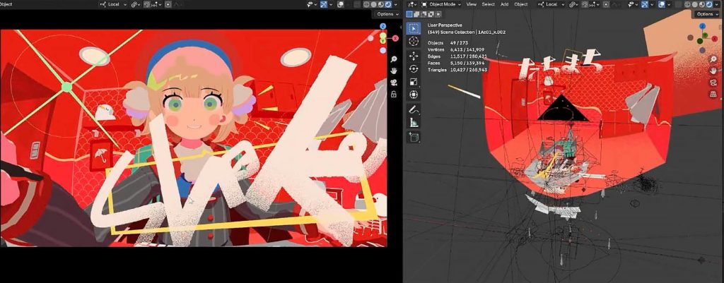 歌詞のモーションデザインも含めて全てのアニメーションがBlenderの3Dシーンで付けられた。