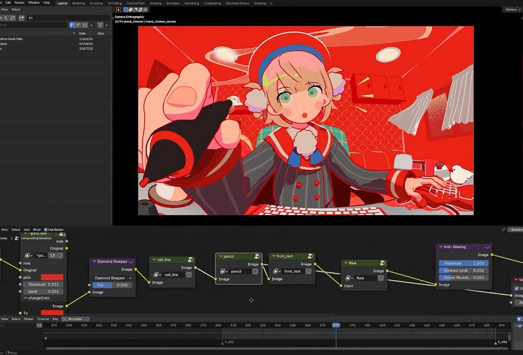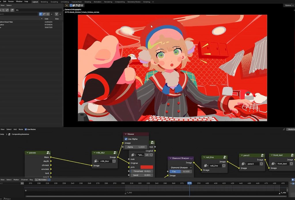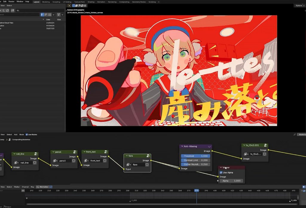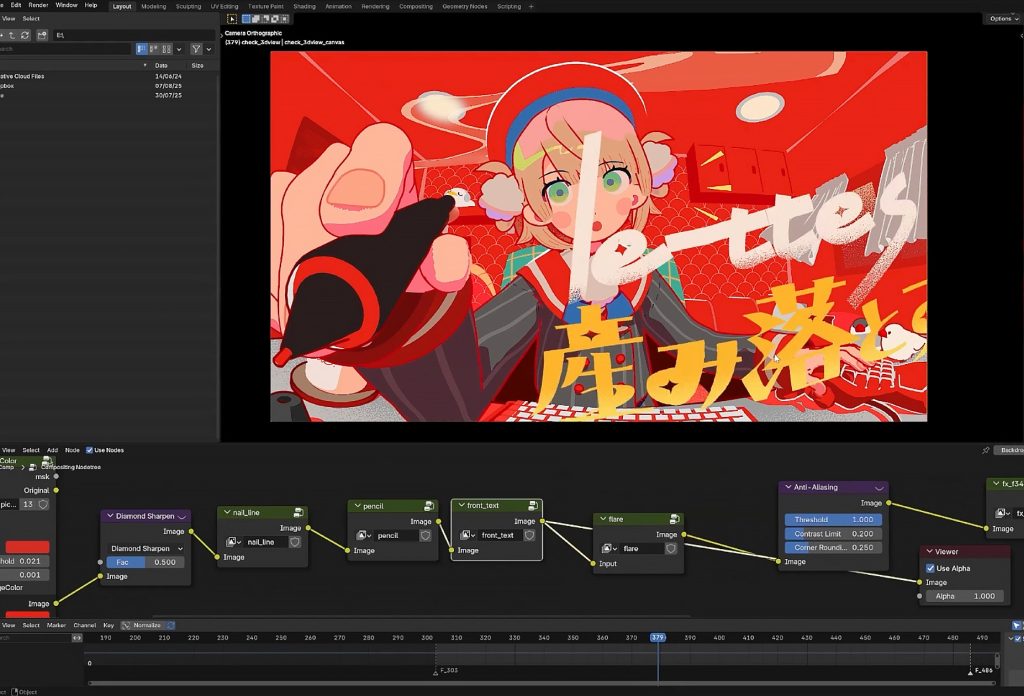 Blenderのコンポジットワークはノードベースで行われる。After Effectsによるコンポジット作業とは勝手が異なる部分があるため、ぽぷりか氏はAEのプリコンポーズに近い挙動で扱うためのアドオンなども自作したという。