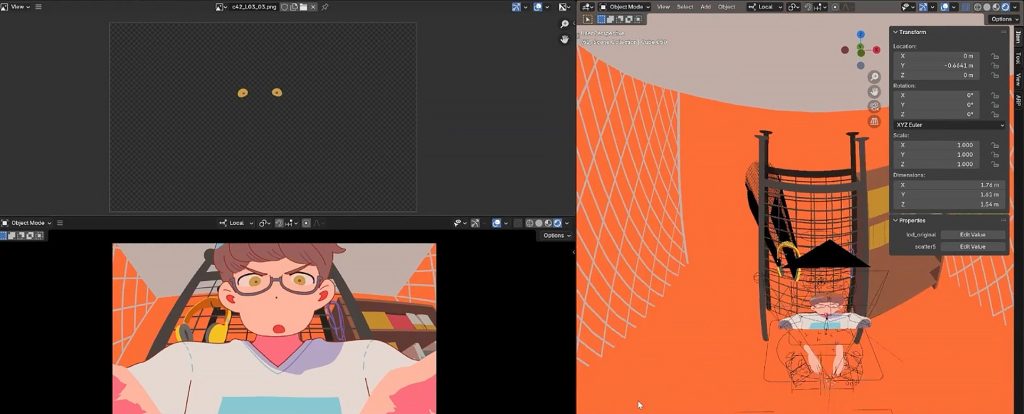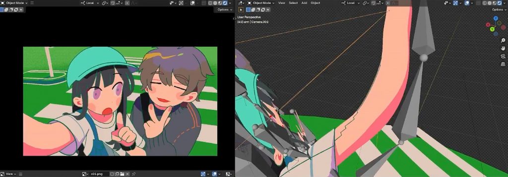 モブキャラのカットアウトアニメーションもBlenderで付けられた。イラスト素材のパーツ分けや背景の3Dシーン化など、一連の作業をおはじき氏が一手に引き受けた。腕や足に加えて、髪の毛や目なども細かくパーツを分けて動きが付けられるようにセットアップされた。
