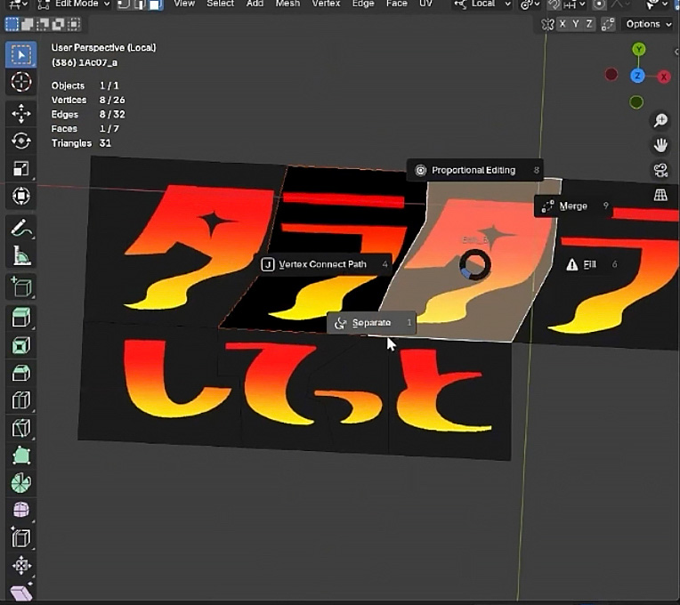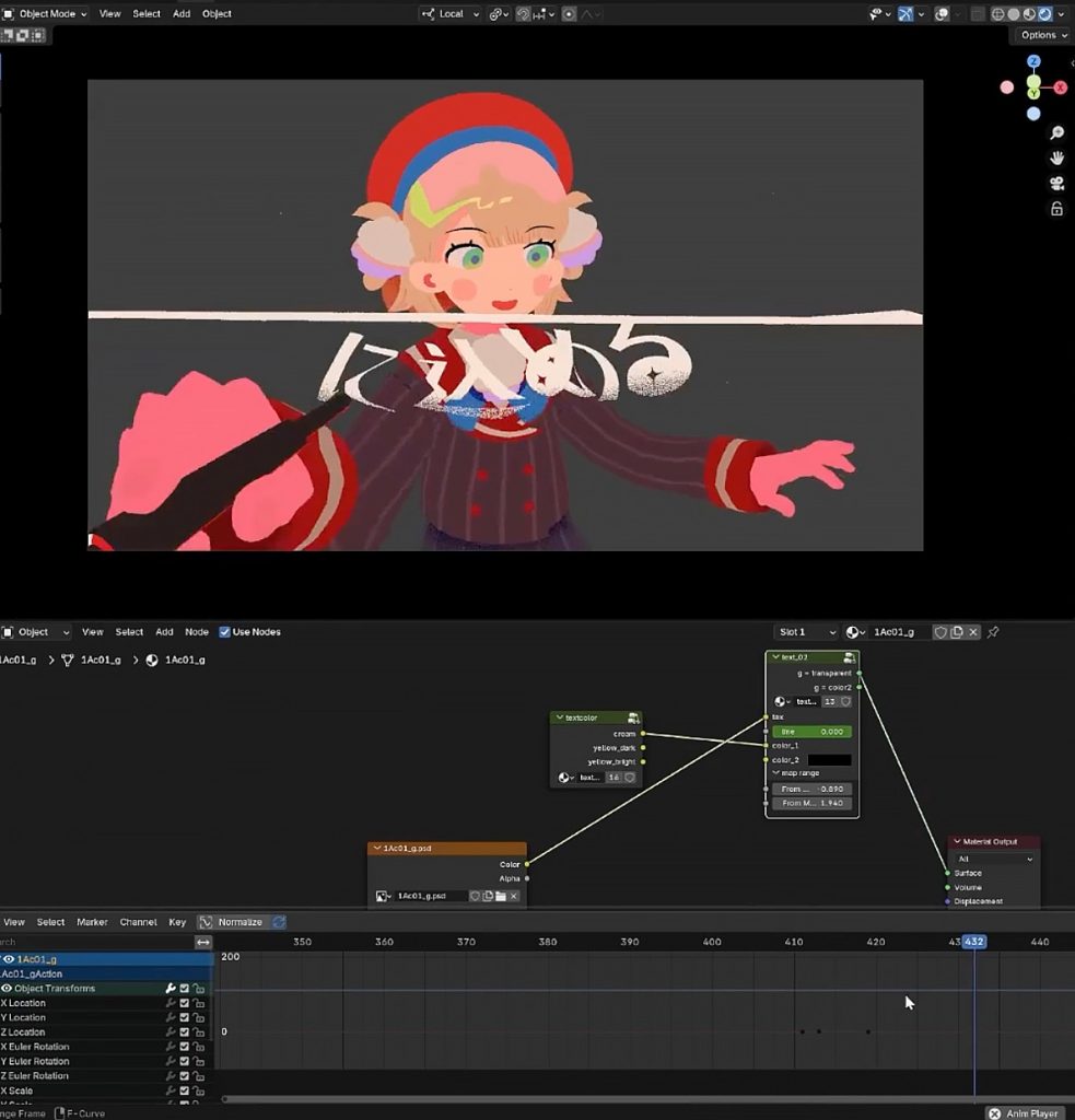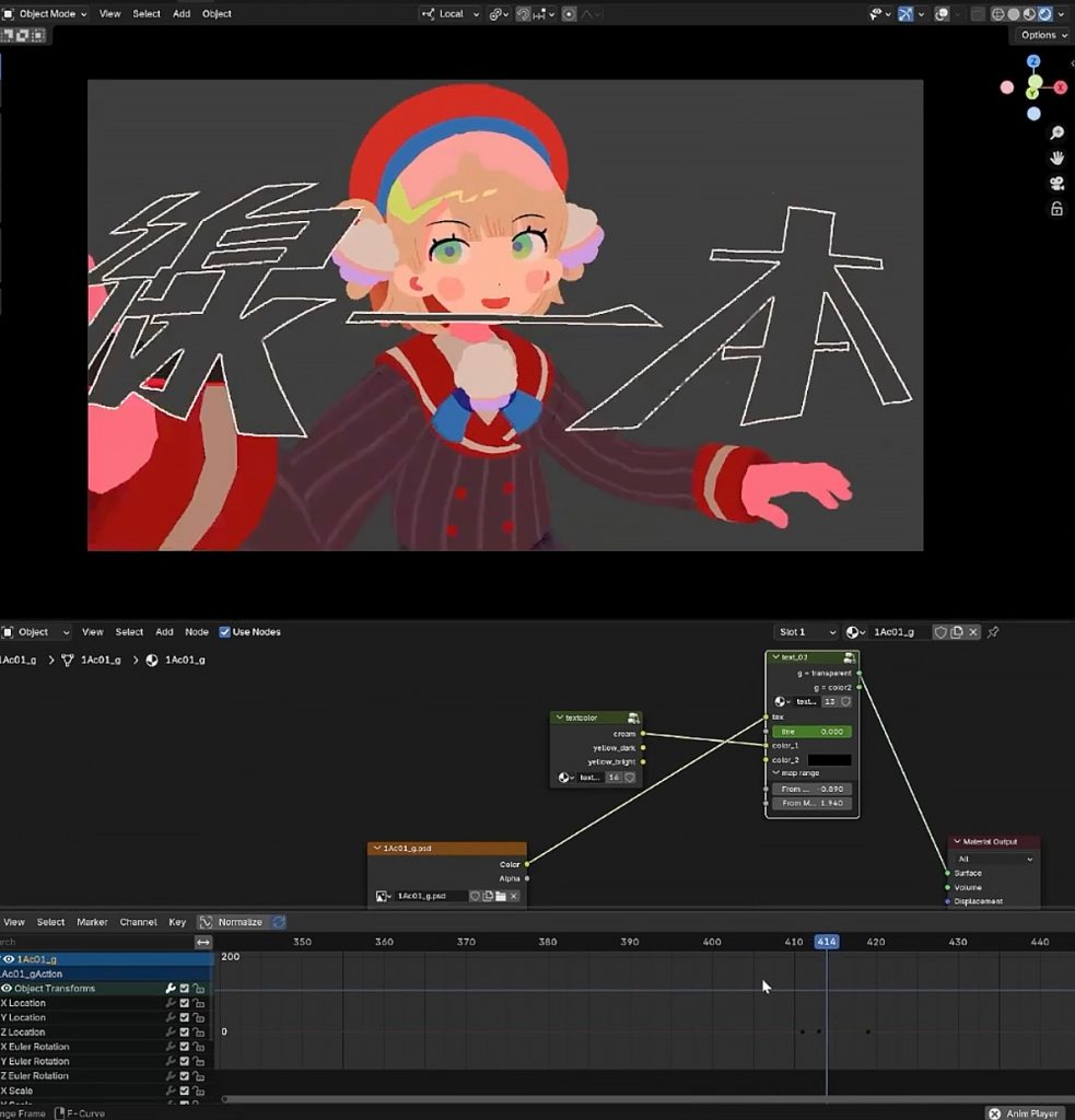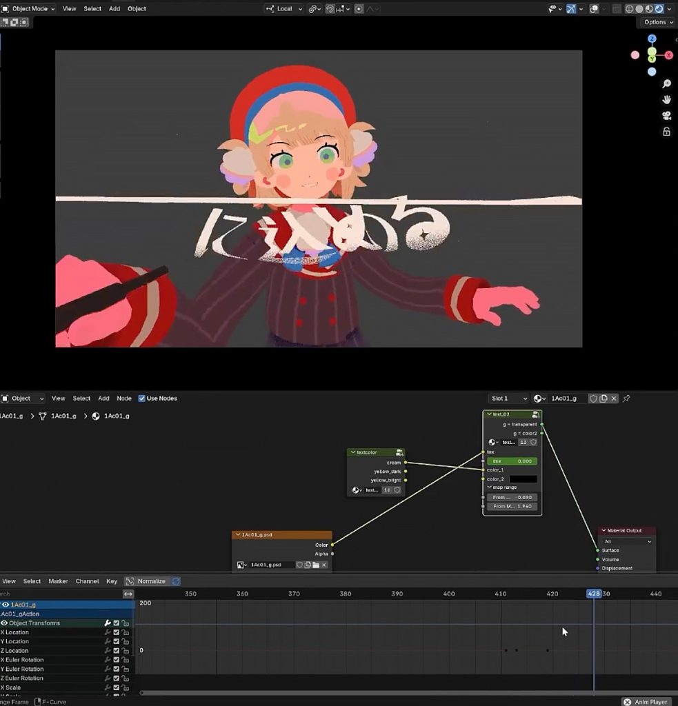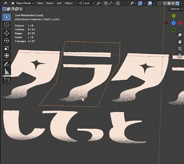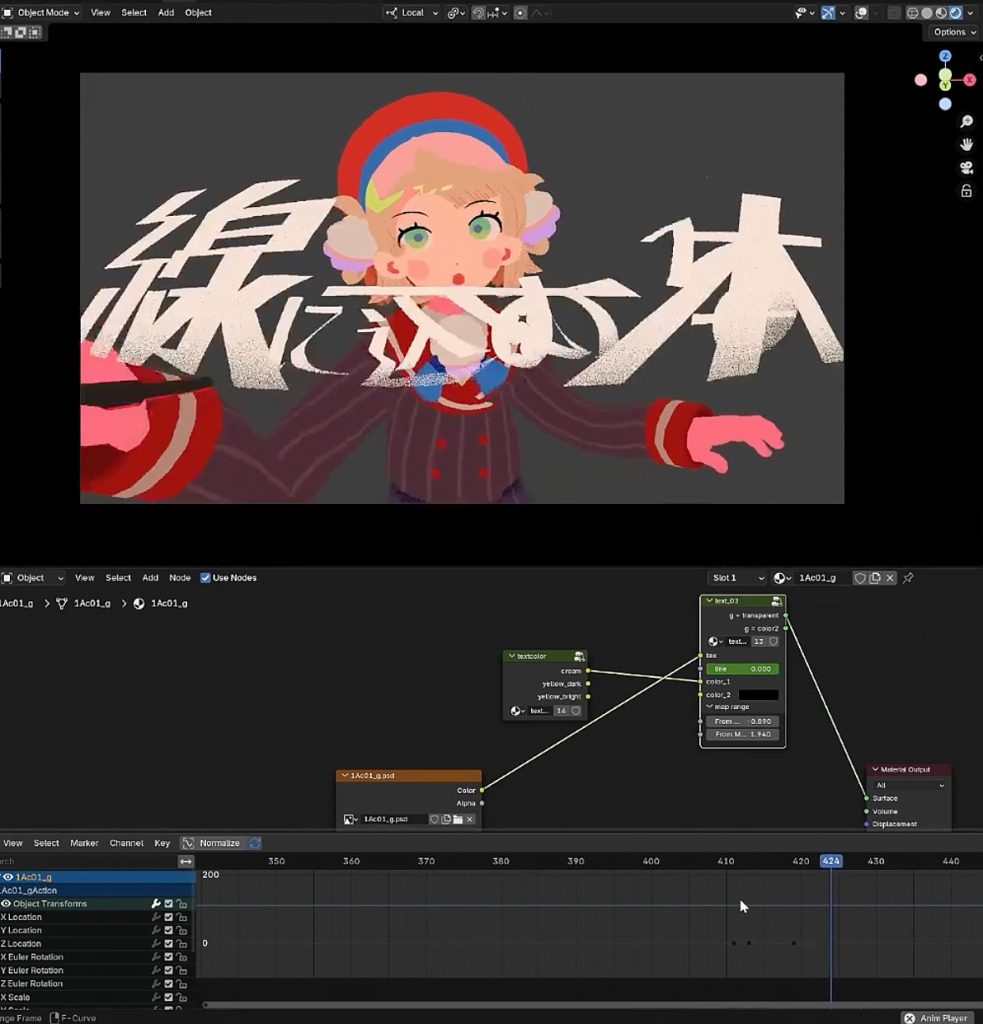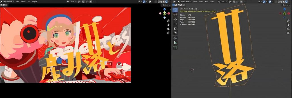 まごつき氏がCLIP STUDIO PAINTで描いた歌詞の文字素材をBlenderに読み込み、ナイフツールで1文字ごとに分解。RGBのRチャンネルを使ってディザ合成でグラデーションを適用する。