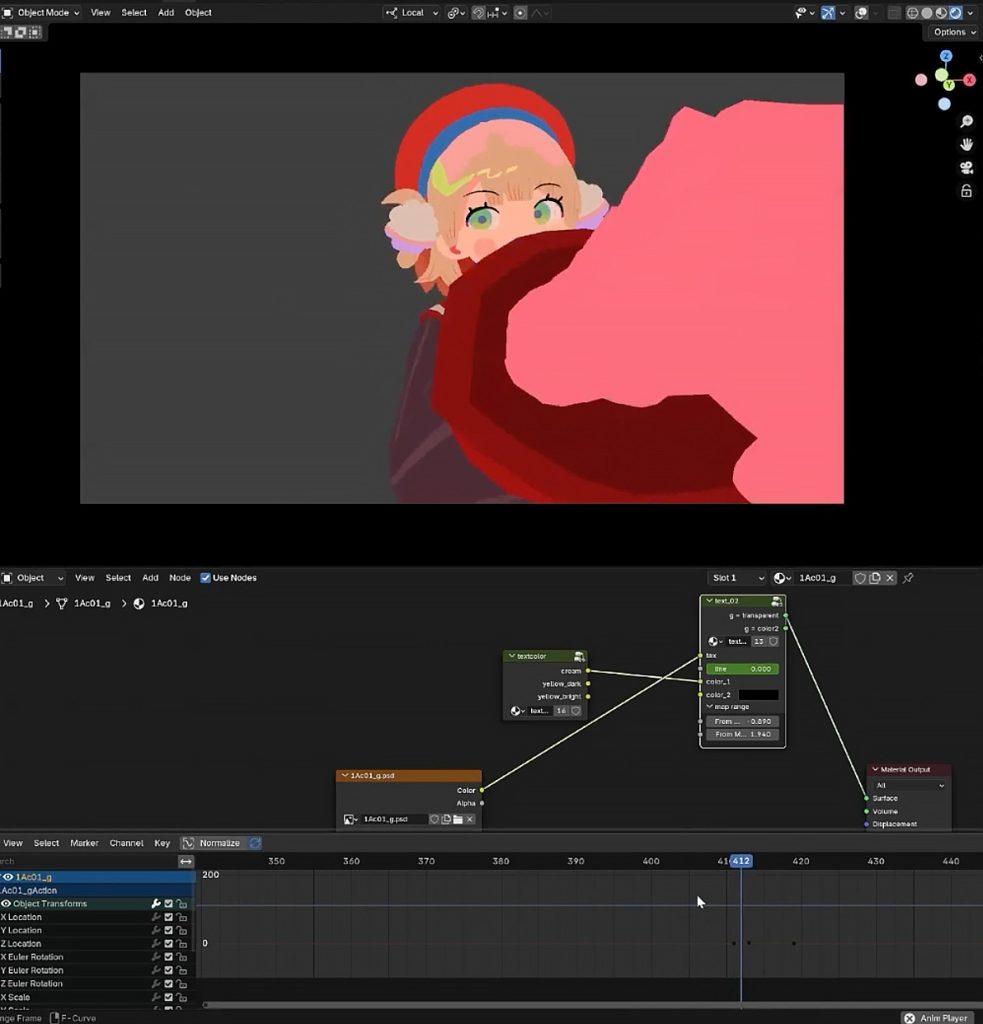 ぽぷりか キャラクターデザインが出来上がったら、ういさんの3Dモデルを作り、ルックデヴを兼ねて実際にアニメーションを作っていきます。今回は作りながら決めていく割合が通常よりも大きくなりました。例えばコンセプトアートでは、ういさんの輪郭線は太めの黒色でしたが、3Dにしたときにその魅力を活かしきれなさそうだったので、線を細くしつつシーン色に近い色へと変更しました。