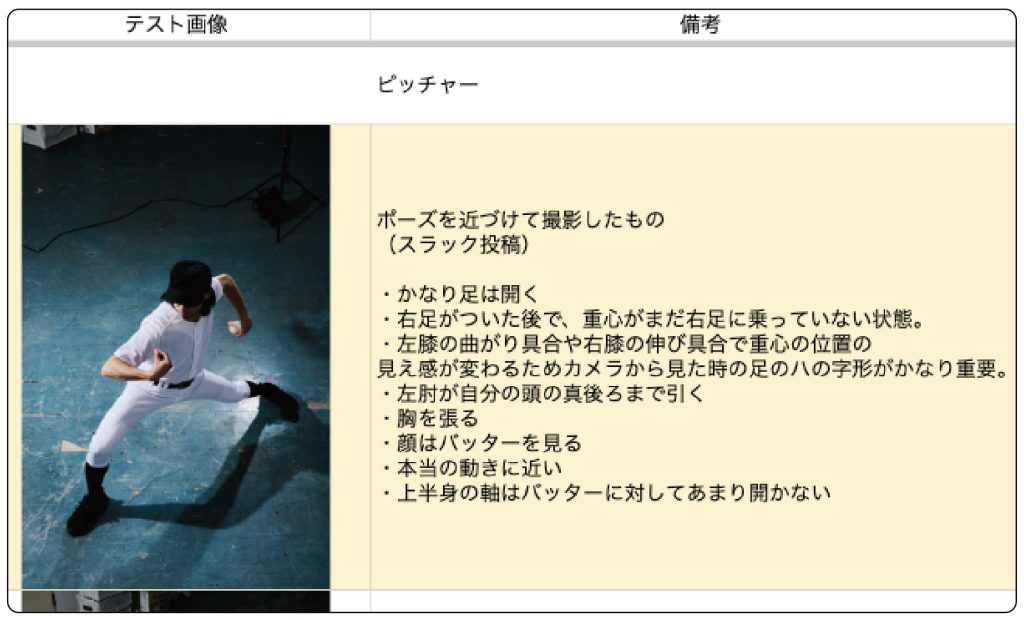 ビジュアルはアートディレクター・伊東友紀さん(110inc.)と組んで仕上げた。ピッチャーとバッターのポーズはあらかじめ決めておく必要があり、テスト撮影の結果と資料(下画像)を伊東さんとシェアしながら詰めていったという。本番では躍動感を出すために実際の投球やスイングの動作をストロボで止めて切り取っている。