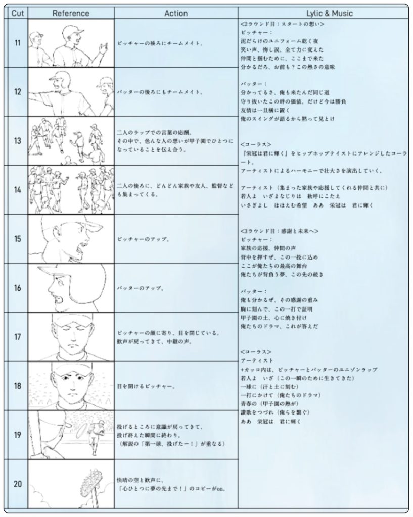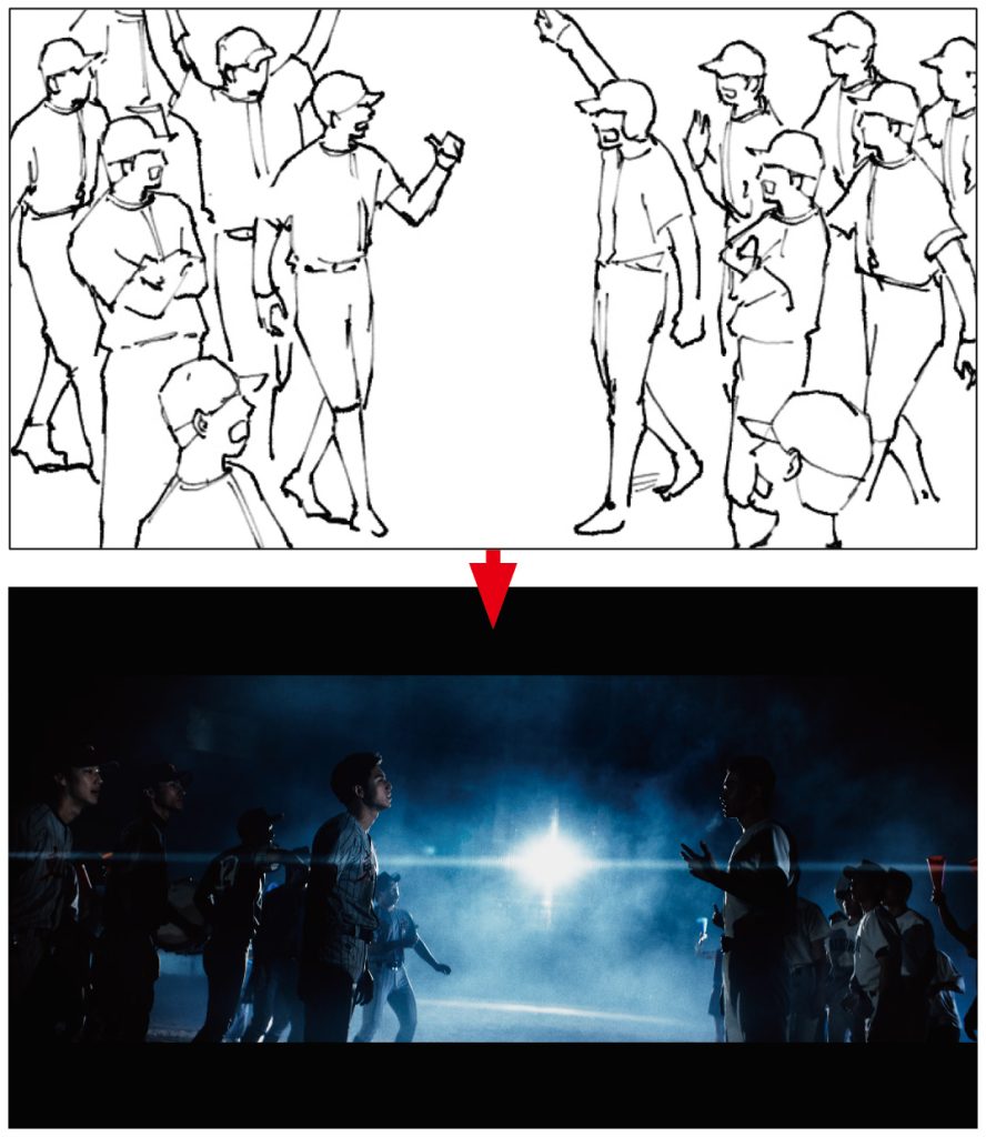 企画が通った後に映像のほうはコンテから着手しました。フォトグラファー出身のディレクターならではのやり方かもしれませんが、印象的な画から考えることが起点になります。今回で言えば、両チームのメンバーが集まってくるカット。異空間みたいにライティングされた球場で、ピッチャーとバッターが熱くラップしていて、そこに仲間たちが集まってくる…この画を撮りたいというのが最初の段階からありました。