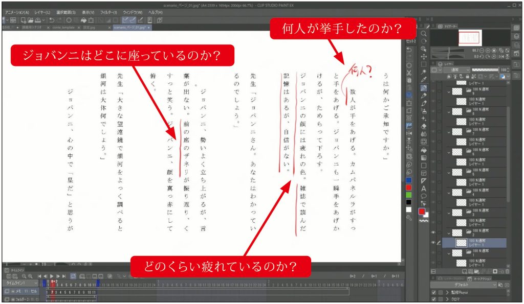 例えば、次頁のような作例であれば、「数人が手をあげる」という表現に対して人数が曖昧なので、「何人?」と書き込んでおいたり、「ジョバンニの顔には疲れの色。」という部分は「どのくらい疲れているのか?」「目の下にクマはあるのか?」などを書いていきます。アニメの場合、シナリオをもらった後に監督と「コンテ打ち」という打ち合わせがあるので、監督の頭の中にしかない細かな意図をコンテ打ちで聞ける状態にしておくことで、その後の作業がスムーズになります。