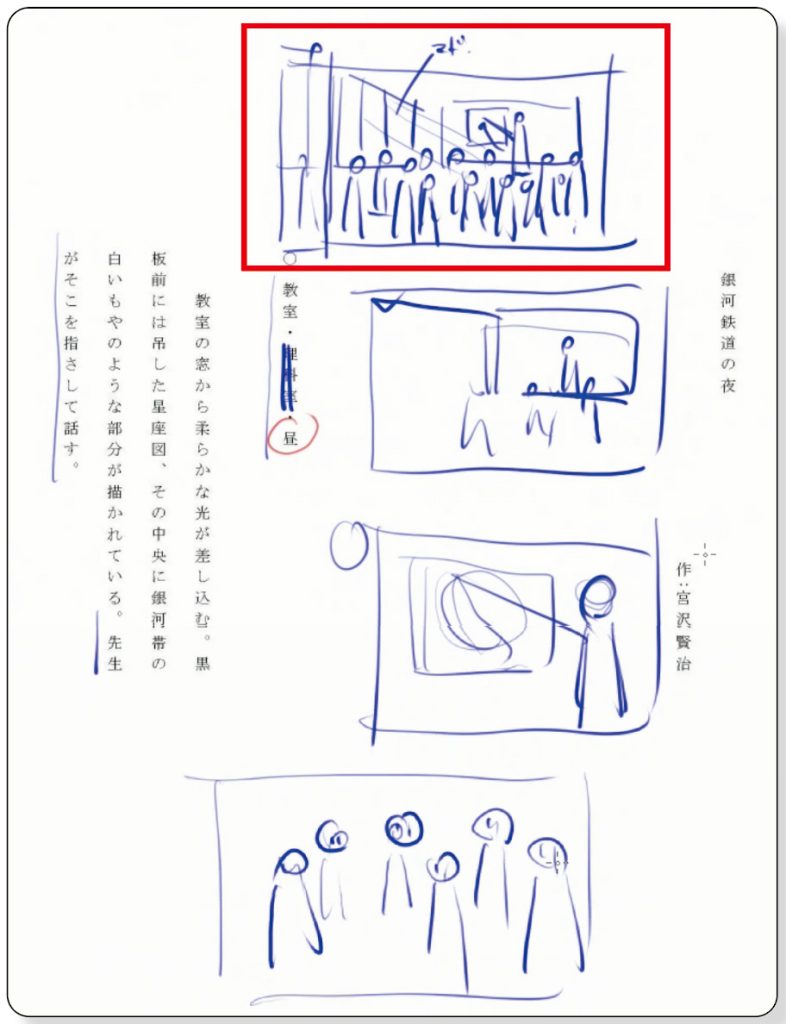 ❶ 昼の教室から始まる1コマ目では、全体がわかるマスターショットからスタート。引いていくカメラワークを赤枠で指示している。