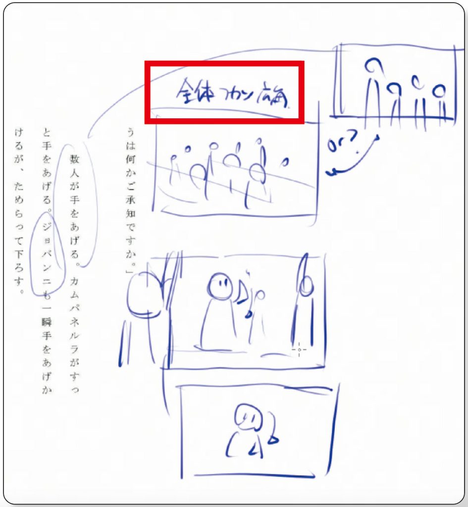 「ここは説明しなくてもいい」と感じた部分は、監督と相談した上であえて描かずに省いてしまう選択肢もあります。絵コンテには選択肢が多くあるので、どちらも描いておいて後からいいほうだけを残すというのも手です。