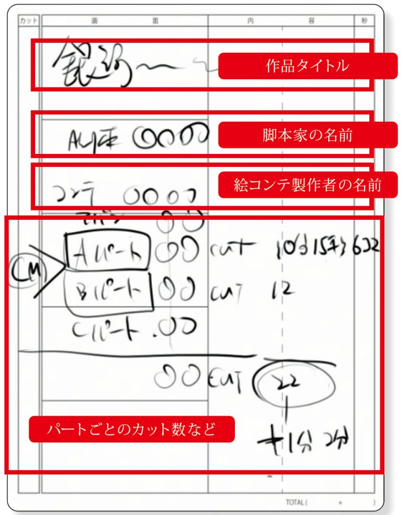 アニメの場合、フォーマットの1ページ目に作品タイトルや脚本家の名前、自身の名前、パートごとのカット数などを書いておきましょう。パートを細分化していくと、まず、「アバン」と呼ばれるOP前に流れるストーリー部分があり、OP、CM、サブタイトルと続きます。その後、前半となるAパートがあり、場合によってはアイキャッチAを挟んでCMとなります。続いて、アイキャッチBから後半のBパートとなり、EDの後にCパートという流れになります。アイキャッチやCパートは作品によってはない場合もあるので、そういった部分も監督とのコンテ打ちで聞いておく必要があります。