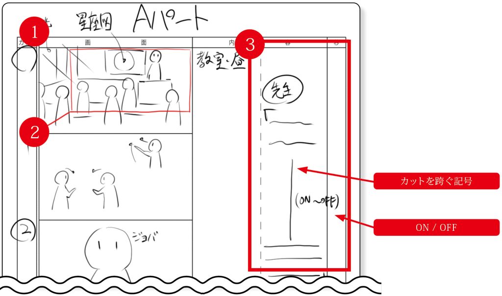 セリフがある場合は、内容欄に記載しましょう。カットを跨ぐ長いセリフの場合は、喋っている人物から別の人物へとカットが変わる場合もあります。その場合、セリフの間に「ON〜OFF」といった記載をするようにしています。これを書いておくことで台本作りの際にも役立ち、実際に声優や役者さんが台本を見ながら演技をする際に自分の演じるキャラが映っているのか、映っていないのかを把握しやすくなります。絵コンテは基本的にアニメーターのための指示書ではありますが、実際には撮影・美術・台本などにも使われるので、様々な要素を意識して描かなければいけないものでもあります。