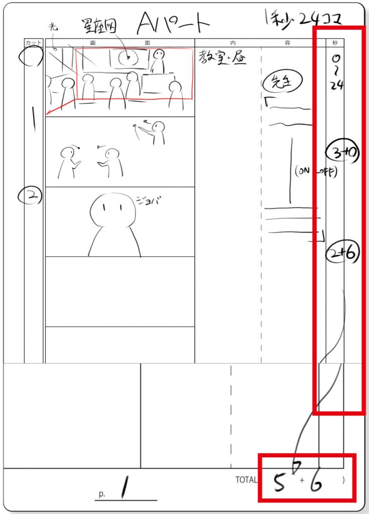 例えば、最初のカットに必要な尺が3秒ちょうどであれば書き方は「3+0」となり、プラスの横の数字はコマ数を表しています。アニメの場合、1秒あたり24コマでできているため、基本的に0〜24の数字が入ることになります。「3+0」であれば、3秒ちょうどという意味ですね。