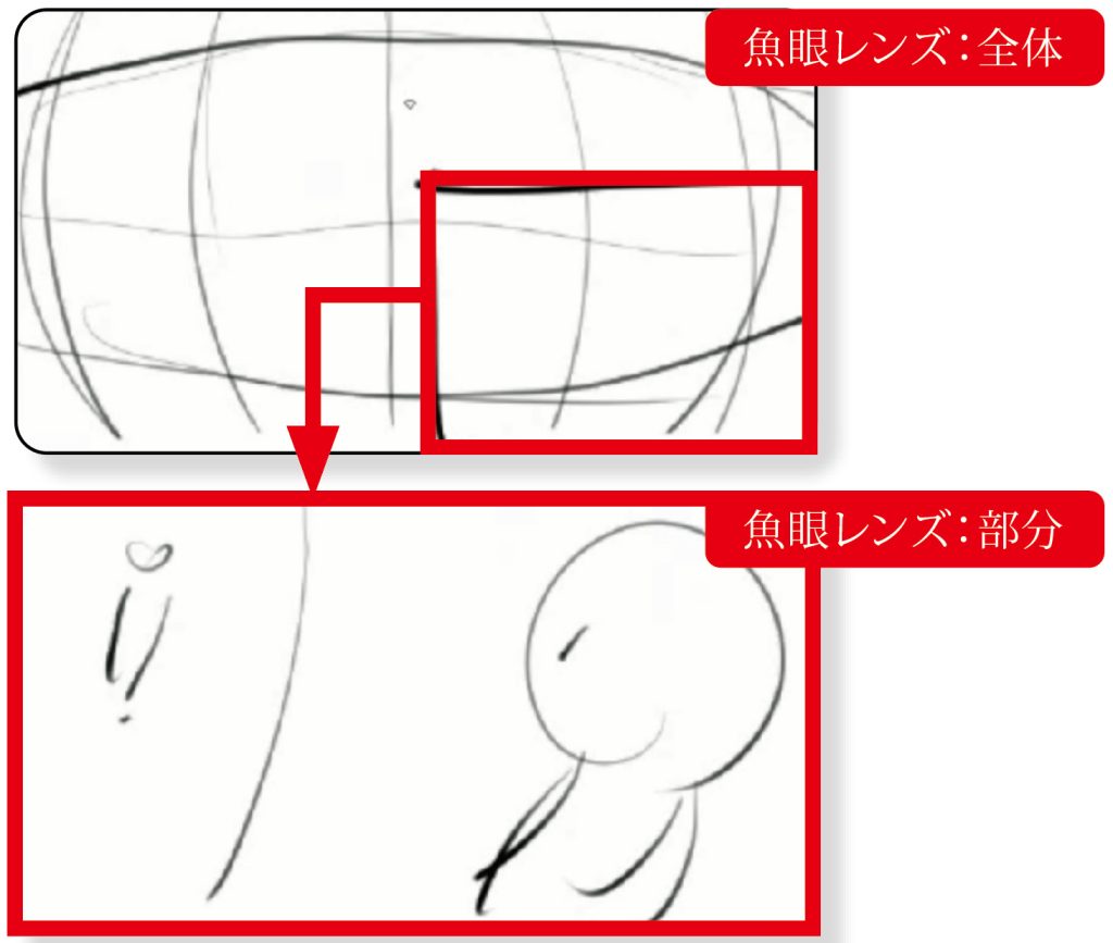 アニメの場合、実写ではできないようなカットも数多くあり、そういったカットをコンテに入れていくことで自由度が増します。例えば、戦闘シーンのようなカットでふたりが向かい合っていて、手前からカメラワークが回り込むようなシーンは、実写だと建物や建造物が大抵存在しているのでそこまで回り込めないんですよね。ただ、アニメであれば嘘をつくことでそういったシーンも表現可能になります。また、魚眼レンズを切り取ったような極端に歪んだパースなどもアニメならではの要素ですね。