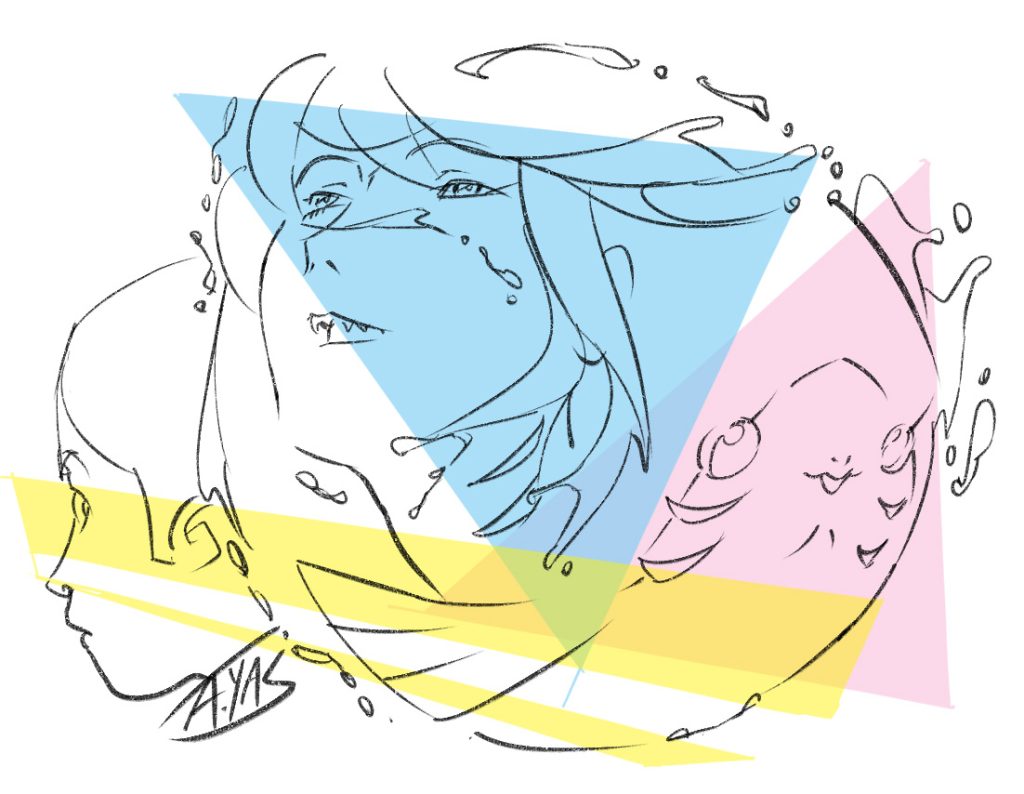 人魚の王国のお姫様。地上にいる時や不安な気持ちの時は魚の姿(左)になり、心を許した相手の前だと人魚の姿(右)になる。