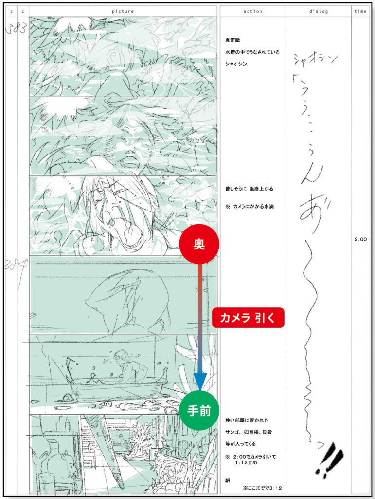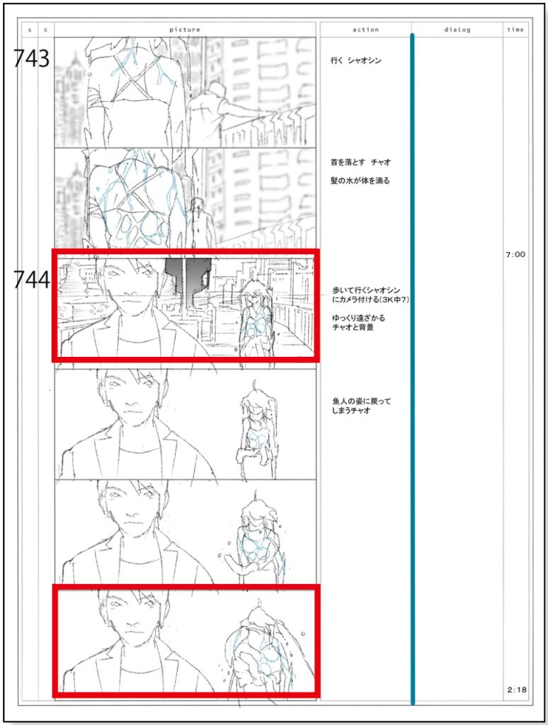 これまでチャオが人魚の姿になるところはあえてあまり見せていなかったのですが、このシーンでは真正面から魚の姿に戻ってしまうところをカットを割らずに見せています。本人からすれば最も見られたくない部分ですが、魚の姿に戻ってしまうシーンこそ、あえて真正面から捉えてやろうという残酷なシーンになっています。
