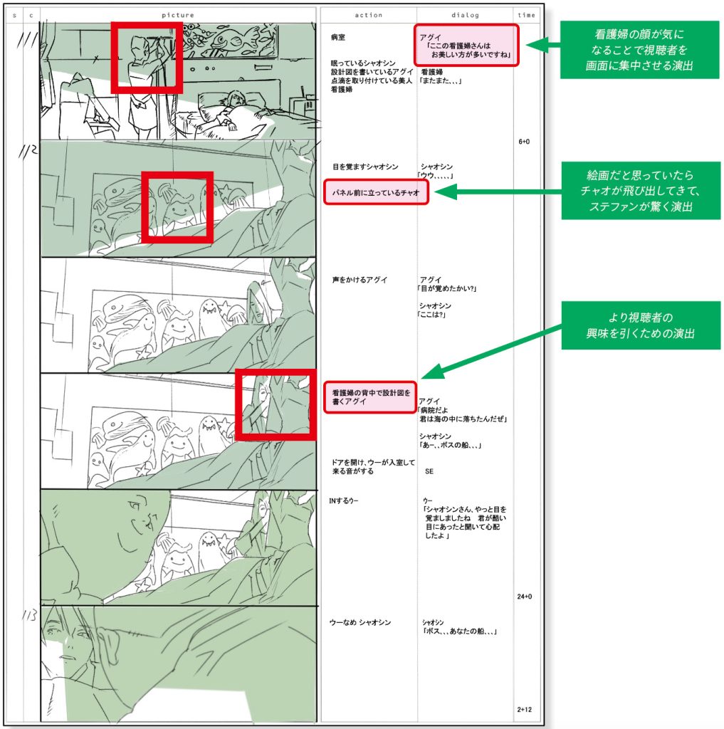 以下の絵コンテは、主人公のステファンが病室で寝ているシーンです。この後、ステファンは人魚族のチャオと結婚するようシー社長から言われる流れになるのですが、シナリオ通りにコンテを起こしていくと事務的になってしまうため、面白く見せるためのショートストーリーをいくつか入れ込んでいます。例えば、ステファンの親友ロベルタの言う「ここの看護婦さんはお美しい方が多いですね」というセリフに対して、視聴者は「どんな美人なんだ?」と気になります。でも、このカットではあえて看護婦さんの顔を見せないようにしていたり、振り向くかと思いきやシー社長の大きな顔に遮られ、結局顔も見せないまま看護婦さんは退出してしまいます。そうすることで、このシーンへの集中力を高めてもらうという狙いがあります。