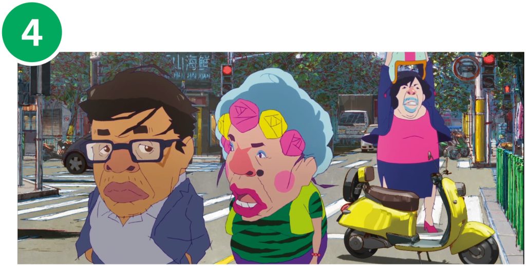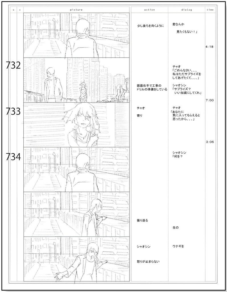 本作は恋愛ものであり、このシーンはまさに別れのシーンなのですが、ストーリーがまだあまり決まっていない頃からすでにイメージボードを描いていたところでもあります。本来なら、メロディアスな音楽がつくような場面ですが、あえて音楽をなしにし、緊張感を生ませて締めるようにしています。工事現場という雑音の多い中で、喧嘩をするという設定を作り、ステファンがチャオにきつい言葉を吐くところでは、ドリルの音がその声と被って聞こえないくらい雑音が大きくなり、手前には車が通って、ふたりの状況だけしか見えないような演出にしています。