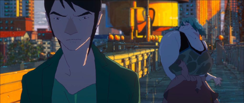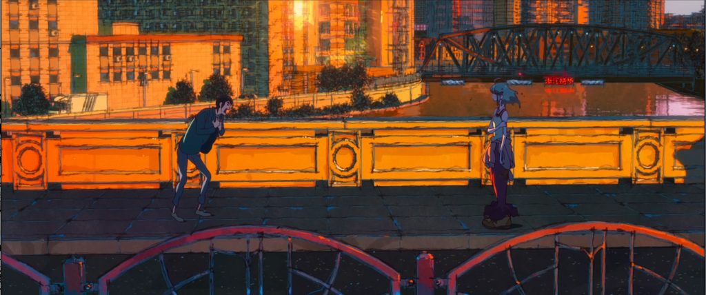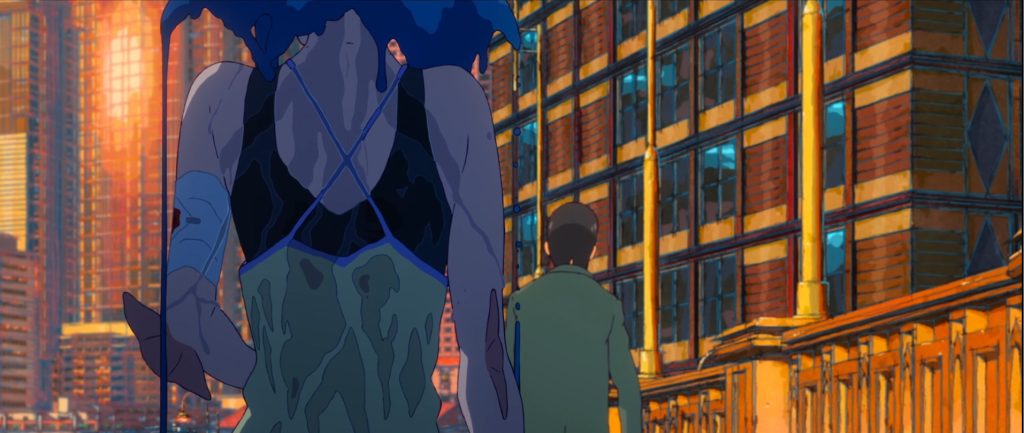 このシーンの背景は、美術監督の滝口さんに「奥の建物の1カ所だけは強く光らせてください」とお願いをし、強く夕焼けが当たってオレンジ色に光った美しい背景を描いてもらっています。これは、僕が六本木を夕方に歩いていたときに実際に見た光景で、気持ちが楽しいときには夕焼けもそう映るけれど、寂しいときには本当に寂しい印象として強く残るんじゃないかと感じ、喧嘩して傷ついてしまったチャオの心の痛みに突き刺さるような光が欲しいと相談してつけてもらった光なんです。また、工事現場の音もふたりのギスギスした感じを表現していたり、人様に見せられないような変身姿や、ずぶ濡れになるまで泣いてしまう姿など、目も当てられないようなシーンにしたくてこういった演出にしています。