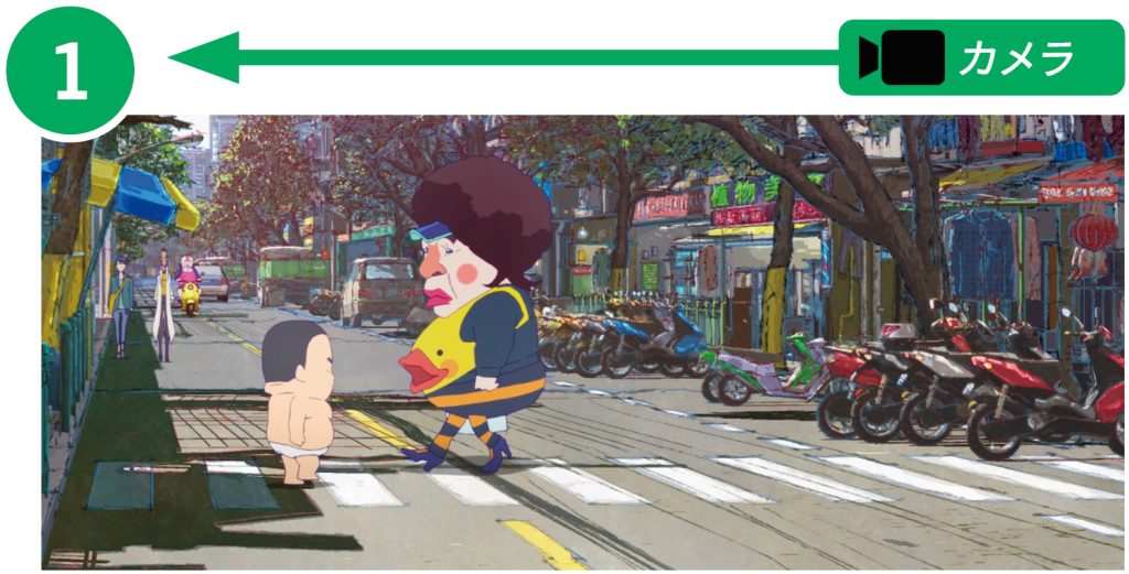さらに、奥の絵画の前には本作のヒロインであるチャオが実は立っています。しかし、ステファンは気づいておらず、絵だと思っていたら突然チャオが飛び出してきて驚くという演出を入れています。このように、ひとつのシーンだけでも要素がいくつも入っていて、それが本作の面白いところ、かつ私らしい演出であるとも言えます。