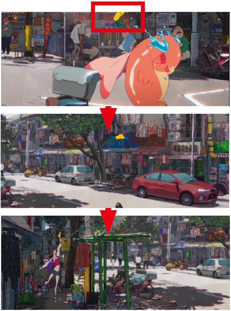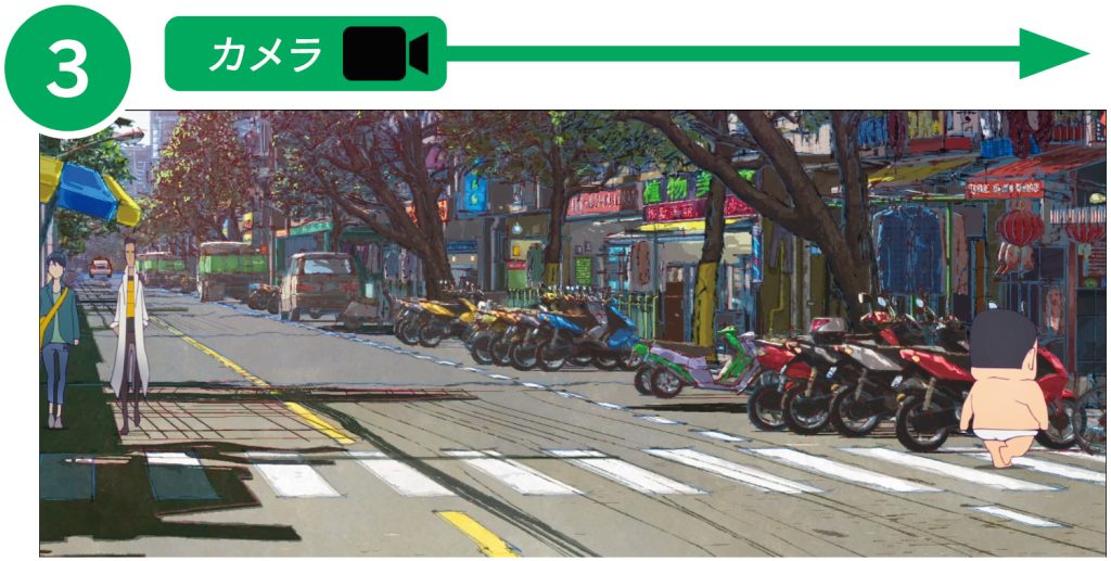 本作では、「どのキャラクターも皆対等な立場でこの街で生活している」というリアリティを追求しています。滝口美術監督のこだわり抜いた背景美術に目が行く以下のシーンでも、おばさんが横切ると奥からバイクに乗ったオメデ大使というキャラクターが通ったり、ステファンとロベルタが歩いてきて、カメラが振り向くとステファンの叔父さんと叔母さんが歩いていたりします。ここでは、各キャラクターの街での生活を描くことで、皆ただの脇役ではなくステファンというキャラクターにしっかりと関わる人物のひとりひとりとして存在すると感じられるようにしました。アニメとは言ってしまえば作りごとなので、それを自然に見せるための計算をしながら作っていく必要があります。そういった意味でも街での生活シーンは、一見地味に見えるけれど、どんちゃん騒ぎをするようなアクションよりも大変ですし、とても大事なシーンなんですよね。