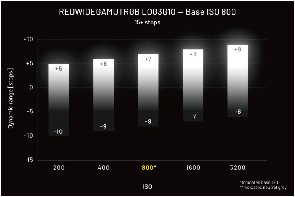 ベースISO感度を800に設定したときのNikon ZRのダイナミックレンジが左の図だ。たとえばISO 200にすると、ISO 800よりもハイライト側の階調は失われるものの、シャドウ側の階調が豊かになる。ISO感度の数値を変えても、15+ストップのダイナミックレンジの幅は一定となっている。