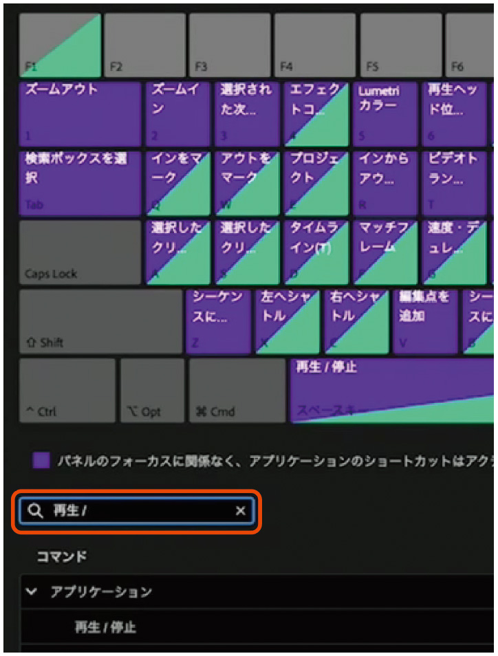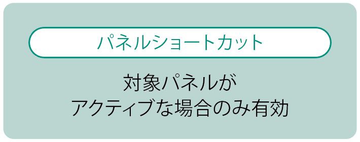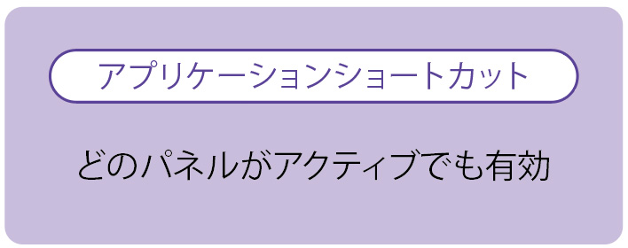 ここで注意したいのは、どのパネルがアクティブでも使える「アプリケーションショートカット」と、対象パネルがアクティブな場合のみ有効になる「パネルショートカット」の2種類があること。ダイアログのキーボード上では、アプリケーションショートカットは紫色、パネルショートカットは黄緑色で表示されます。このふたつのショートカットは同一のキーに設定することができ、この“複合ショートカット”を駆使して時短を加速させましょう。なお、その場合はアクティブなパネルのショートカットが優先されます。楽になりますので、おすすめです。