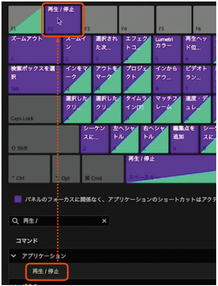 Premiereのショートカットは、[キーボードショートカット]ダイアログで設定します。[コマンド]で使用したいコマンドを探し、ダイアログ上部に表示されているキーボードの任意のキーにドラッグするだけで設定できます。