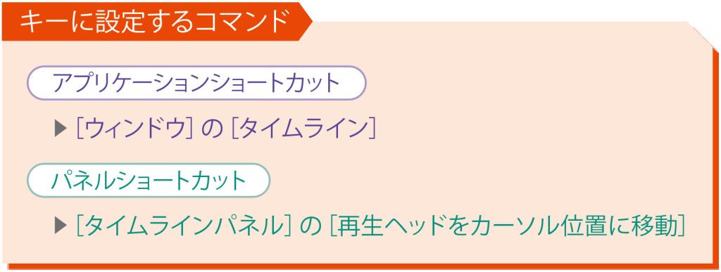 タイムラインパネルショートカットの[再生ヘッドをカーソル位置に移動]を使うと、タイムライン上のどこにカーソルがあっても瞬時にそこに再生ヘッドが移動します。ただ、タイムラインパネルショートカットであるため、ほかのパネルがアクティブだとこのショートカットが効きません。そこで、アプリケーションショートカットの[タイムライン]を同一キーに設定。これで、ほかのパネルがアクティブでも、ショートカットを押すとタイムラインがアクティブに、もう一度押すと[再生ヘッドをカーソル位置に移動]が有効になります。