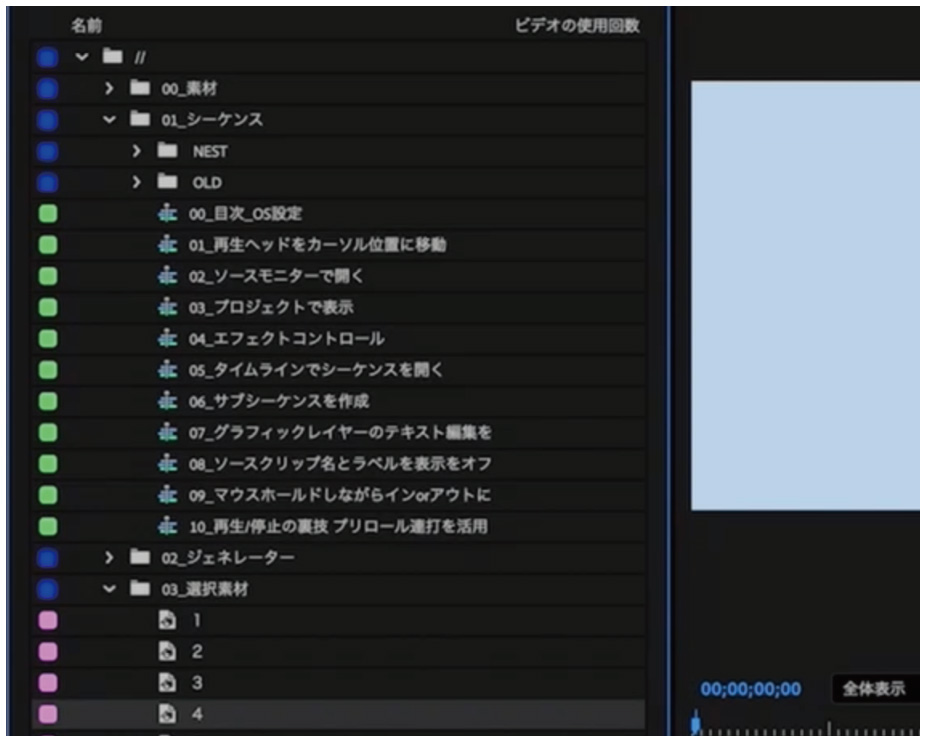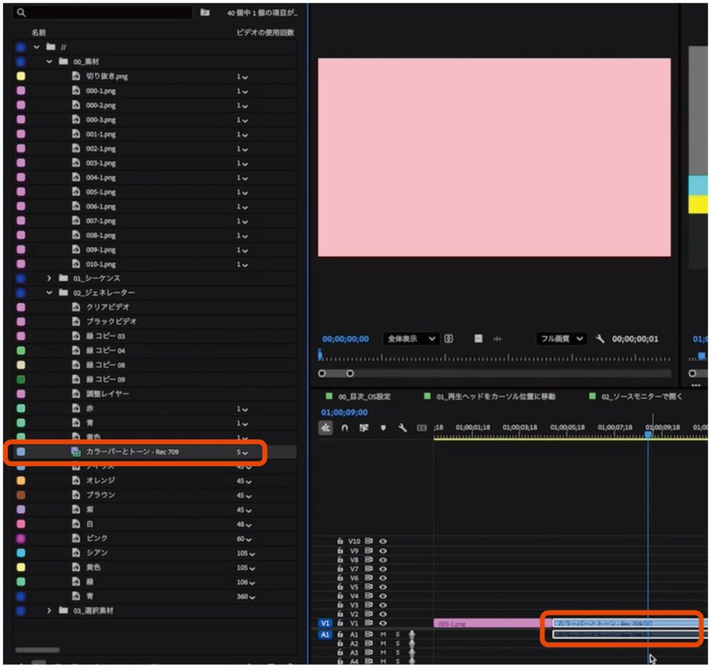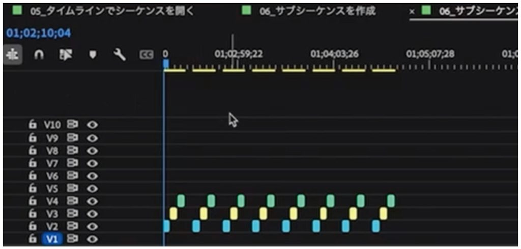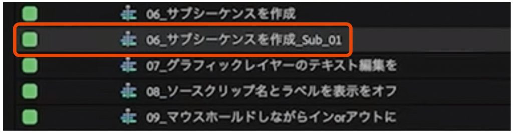 こうすれば、テロップを編集したクリップだけ色を変えておき、その色のクリップだけ選択してサブシーケンスを作成するという使い方もできますし、特定のエフェクトがかかっているクリップだけ色を付けて、何のエフェクトがかかっているかを区別しやすくするという使い方もできます。