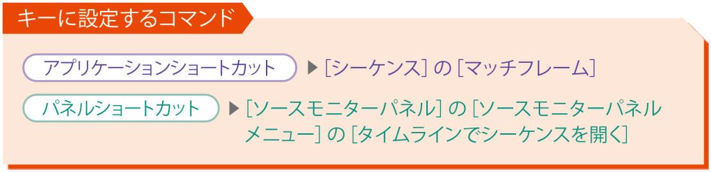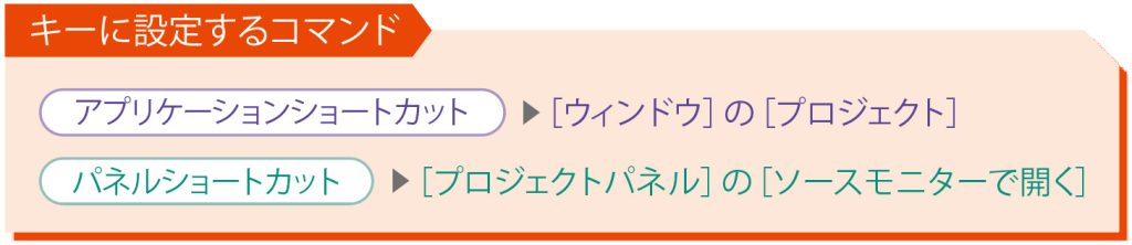 プロジェクトパネルショートカットの[ソースモニターで開く]を使うと、プロジェクトパネルで選択中の素材をソースモニターで開けます。ただ、ソースモニターがアクティブになり、プロジェクトパネルに戻る手間がかかります。そこで、アプリケーションショートカットの[プロジェクト]を同一キーに設定しましょう。
