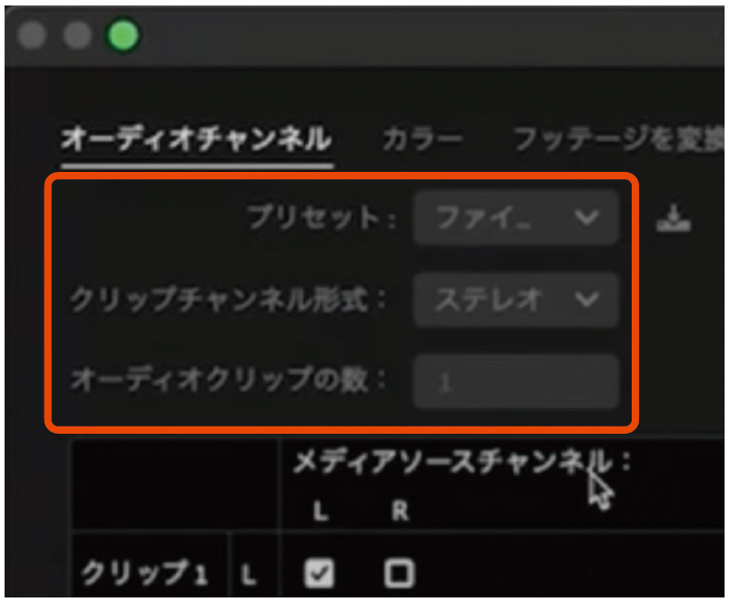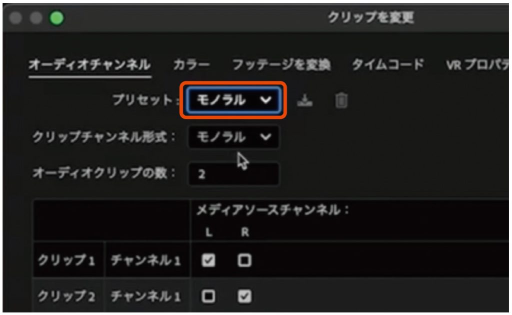 こうしておけば、クリップの元素材をプロジェクトパネルで表示したあとで再度ショートカットを押すと、素材のオーディオチャンネルの設定画面が表示され、[プリセット]などを素早く変更できます。たとえば、テレビ番組の編集では、ステレオをモノラルに変えたい場合などがよくあり、非常に重宝します。