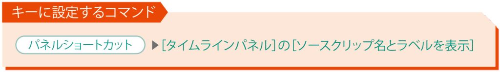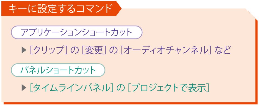 このショートカットを使うと、プロジェクトパネルがアクティブになるため、同一キーには、アプリケーションショートカットかプロジェクトパネルショートカットを組み合わせられますが、私の場合はアプリケーションショートカットの[オーディオチャンネル]をよく組み合わせます。