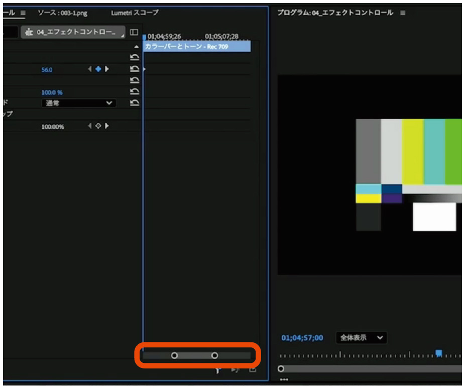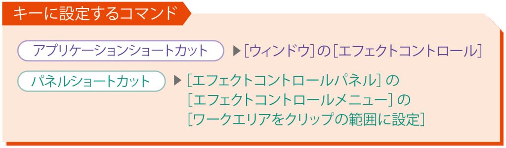 キーフレームは、エフェクトコントロールパネルのタイムラインビューで設定しますが、初期状態で有効になっている[ワークエリアをクリップの範囲に設定]というコマンドにより、表示範囲が狭くなっています。エフェクトコントロールパネルショートカットの[ワークエリアをクリップの範囲に設定]を使えば、このコマンドを無効にでき、表示範囲が広がって設定しやすくなります。なお、エフェクトコントロールパネルを素早くアクティブにするため、アプリケーションショートカットの[エフェクトコントロール]を同一キーに設定しましょう。