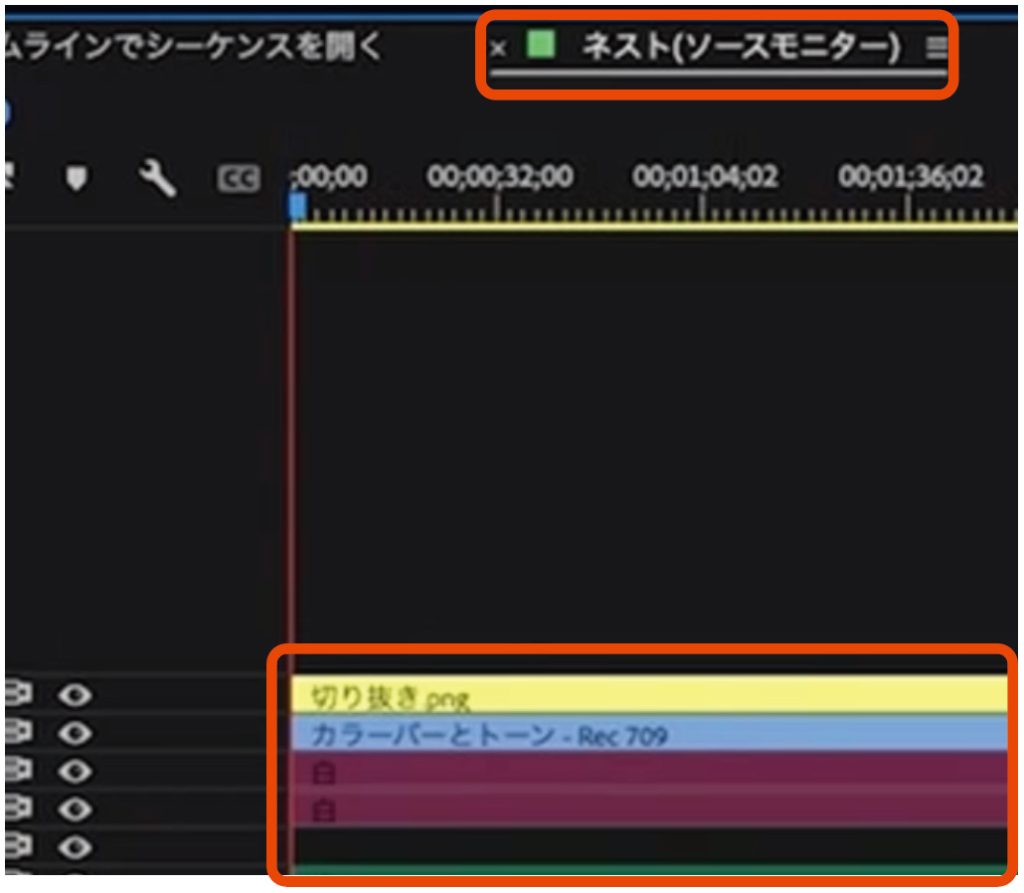 1: タイムラインで選択中のネスト化されたシーケンスがソースモニターで開く。