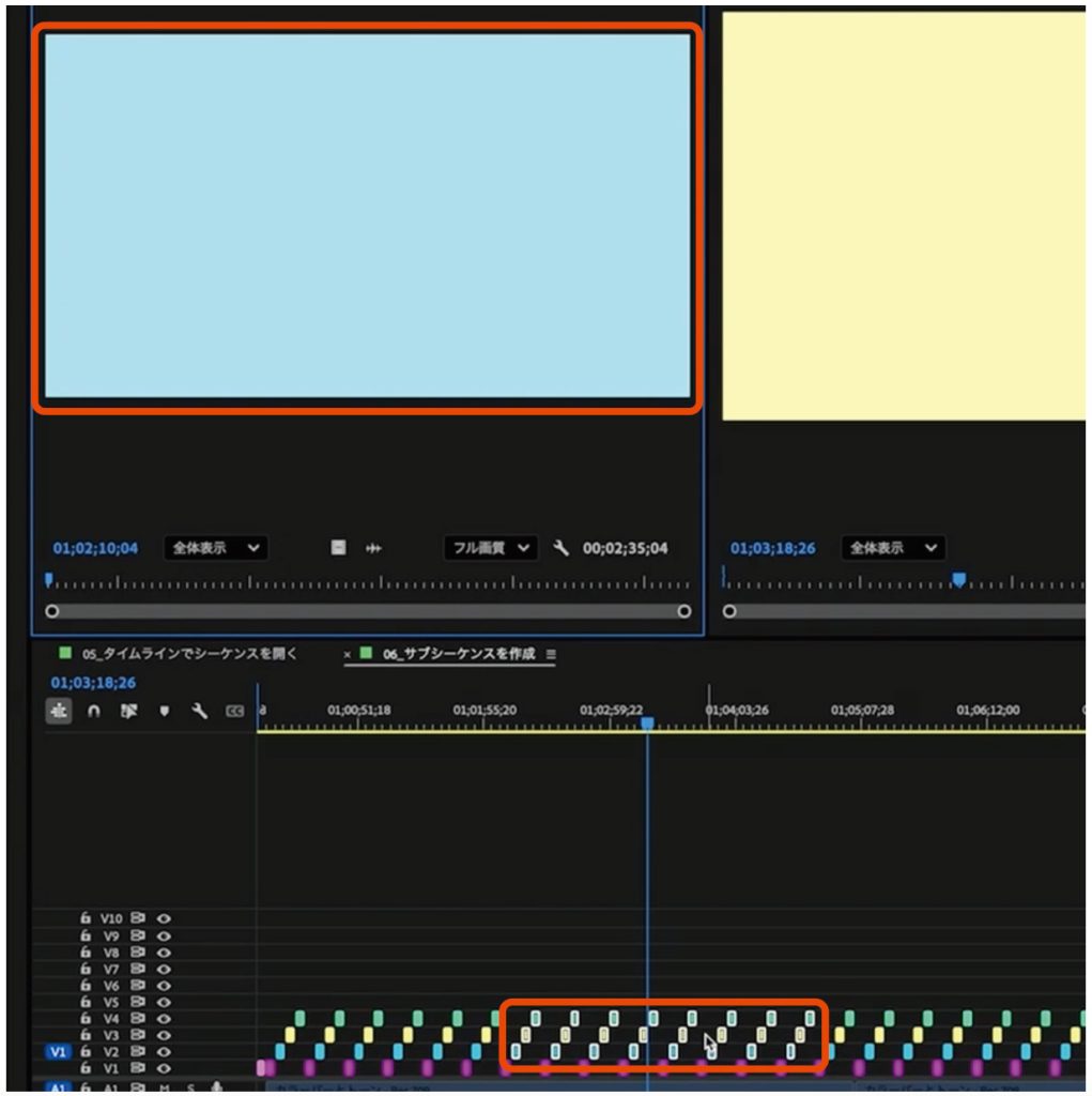 2:ソースモニターで表示されているサブシーケンスがプロジェクトパネルで選択される。