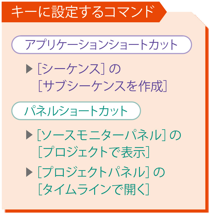 そこでまず、ソースモニターパネルショートカットの[プロジェクトで表示]を同一キーに組み合わせます。これで、ショートカットを1回押すとサブシーケンス作成され、2回押すとソースモニターで開いているものがプロジェクトパネルで選択されるようになります。最後に、プロジェクトパネルショートカットの[タイムラインで開く]も同一キーに設定しましょう。これで、ショートカットを3回押せば、サブシーケンスが開くようになります。