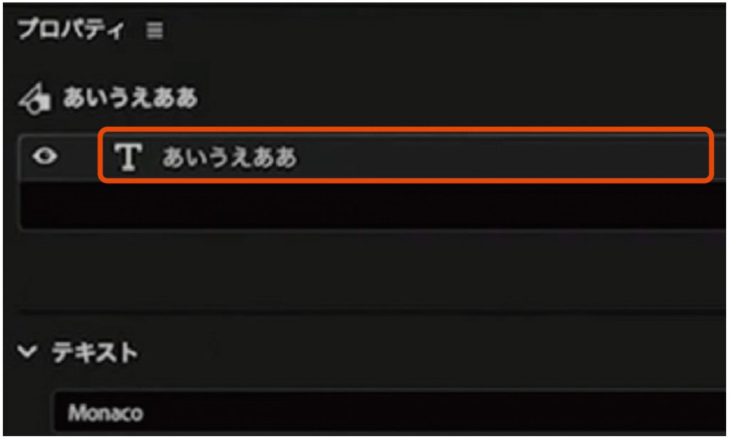 1: タイムラインで選択中のテキストのレイヤーがプロパティパネルで選択される。