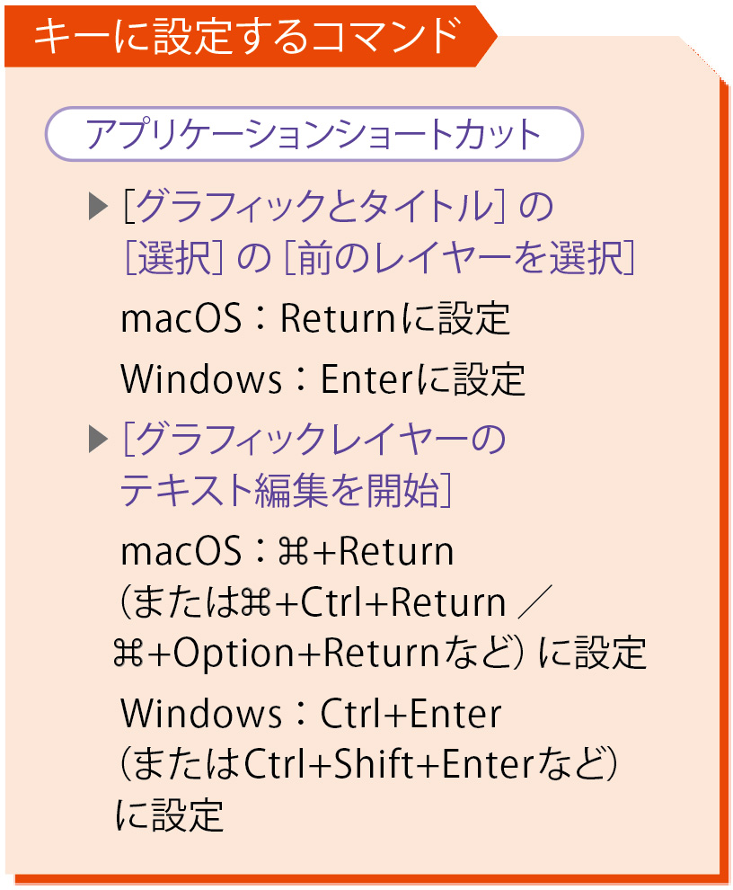 次に、テキストの編集を開始できるようにしましょう。Premiereでは、テキストの編集を確定して終了するには、Photoshopと同様に⌘+Returnを押します。ただ、Photoshopと違ってPremiereでは、⌘+Returnを再度押してもテキストの編集を開始できません。そこで、アプリケーションショートカットの[グラフィックレイヤーのテキスト編集を開始]を⌘+Returnに設定しましょう。
